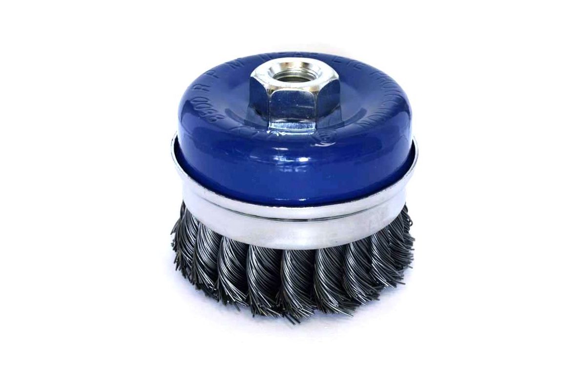 Для угловых шлифмашин. Резьбовая посадка на шпиндель М14. Кордщетка усилена кольцом. Короткая жесткая витая стальная проволока толщиной 0,5мм. Для грубой обработки толстого металла, снятия ржавчины, толстых слоев краски с металлических и каменных поверхностей, удаления окалины, обработки сварных швов.