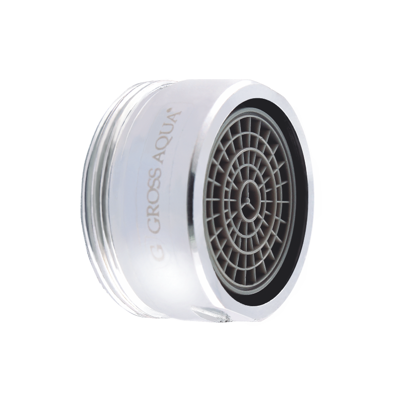 Аэратор GROSS AQUA Eco Flow с универсальным соединением M24 в комплекте с латунным корпусом и уплотнительной прокладкой. Функция снижения расхода воды без потери напора