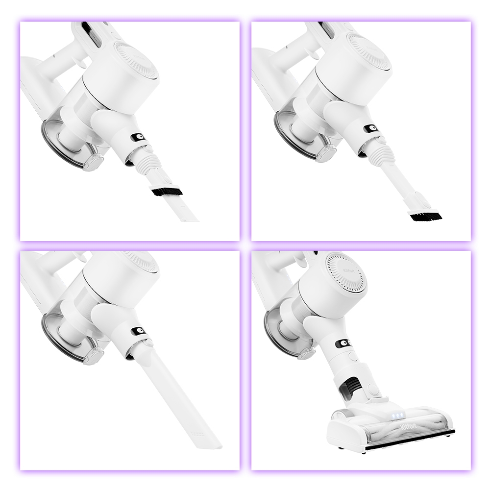 Беспроводной пылесос КТ-5117 очень удобен при оперативной уборке. Благодаря работе от аккумулятора не нужно включать вилку в розетку, провода не мешают под ногами. Поэтому пылесос имеет неограниченный радиус действия: от любого уголка квартиры до машины. Пылесос комплектуется турбощёткой для качественной очистки гладких и ковровых покрытий. Также к пылесосу прилагаются насадка «2 в 1» с ворсовой частью для труднодоступных мест, узкая насадка и дополнительный держатель насадок на удлинительной трубке. Кнопки включения и выбора скорости пылесоса находятся на рукоятке, что позволяет вам с удобством и быстротой включить и выключить прибор, а также выбрать нажатием одну из двух скоростей работы. На низкой скорости пылесос работает до 34 минут.