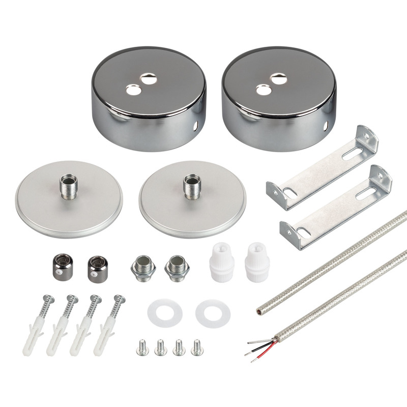 Подвес горизонтальный для профиля SL-ROUND-D70-360deg, длина 2 м. В комплекте: монтажная чаша - 2 шт., токопроводящий кабель-подвес 2 шт. по 2 м (сечение кабеля - 2х0.5 мм²), фиксатор кабеля-подвеса - 2 шт., заглушка без отверстия - 2 шт., фиксатор резьбы с винтом - 2 шт., резьбовая втулка - 2 шт., прижимная втулка - 2 шт.. Цена за комплект.