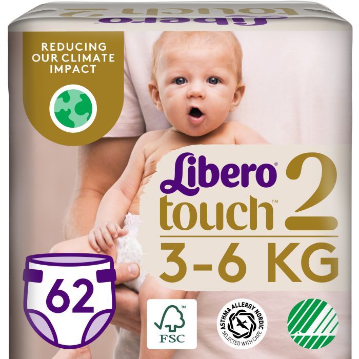 Libero Touch без лосьйонів пройшов дерматологічні тестування, сертифікований Nordic Swan Ecolabel і рекомендований Asthma Allergy Nordic. Крім того, він виготовлений із FSC-сертифікованої целюлози. Продовжуючи шлях зниження впливу Libero на клімат, понад 60% упаковки підгузків виготовлено із переробленого пластику. Ми додаємо поновлювані матеріали для виробництва підгузків, що допомагає зменшити вуглецевий слід Libero . На фабриках з виробництва підгузків Libero використовується тільки сертифікована відновлювана електроенергія.