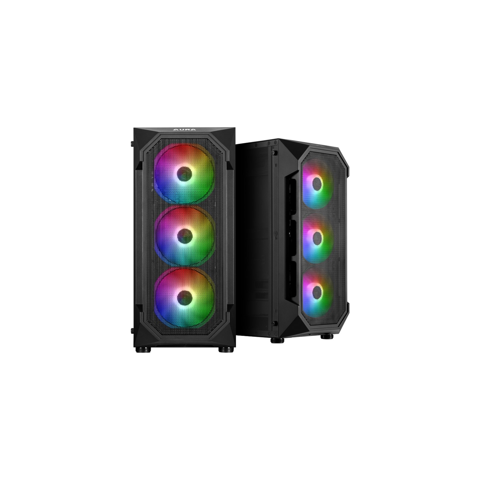 AURA GC1 оснащений сітчастою передньою панеллю, орієнтованою на повітряний потік, з гладким чорним дизайном, що забезпечує естетичний зовнішній вигляд та чудовий приплив повітря. Корпус добре оснащений чотирма вбудованими 120-мм вентиляторами ARGB, повністю виставленими напоказ передньою сітчастою панеллю і бічною панеллю із загартованого скла. Продемонструйте всю внутрішню красу вашої системи за допомогою повнорозмірної кришки із загартованого скла, яку можна легко встановити без інструментів.
