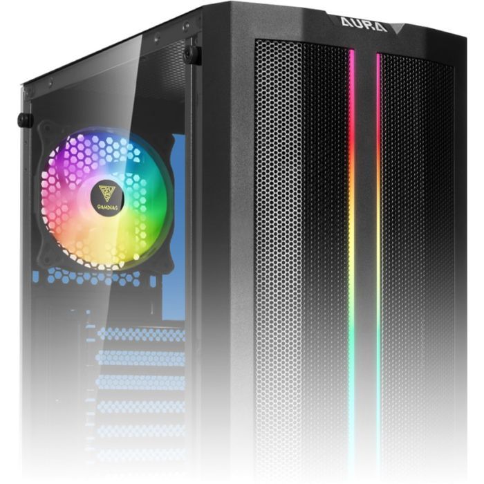 AURA GC3 – це бюджетний корпус формату Mid-Tower із характерним дизайном передньої сітчастої панелі. Дві елегантні смуги RGB-підсвічування на передній панелі, вбудований вентилятор ARGB та панорамна бічна панель із загартованого скла підкреслять красу вашого складання.