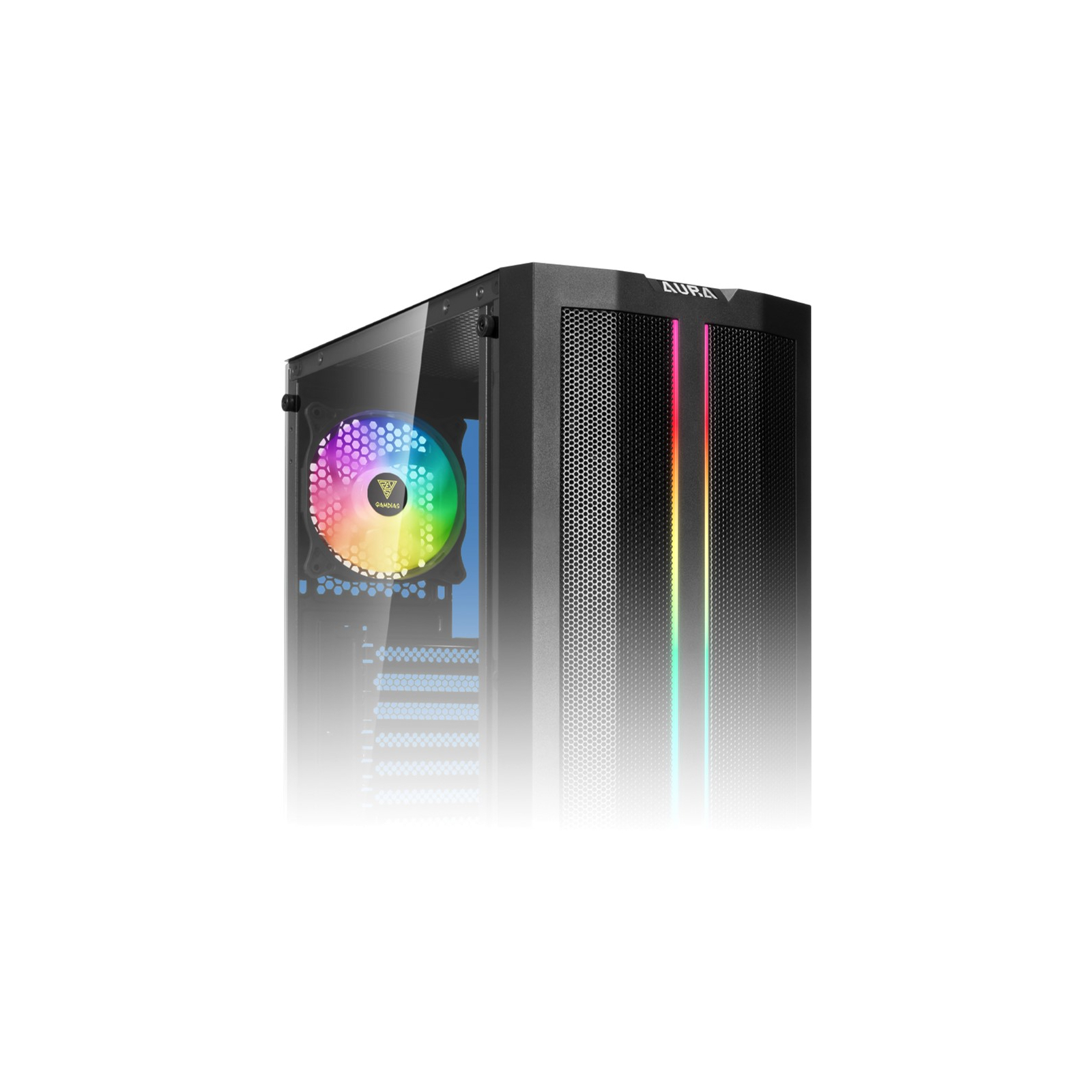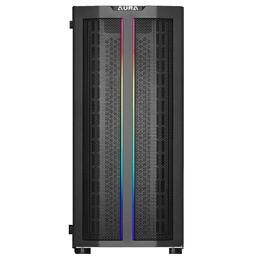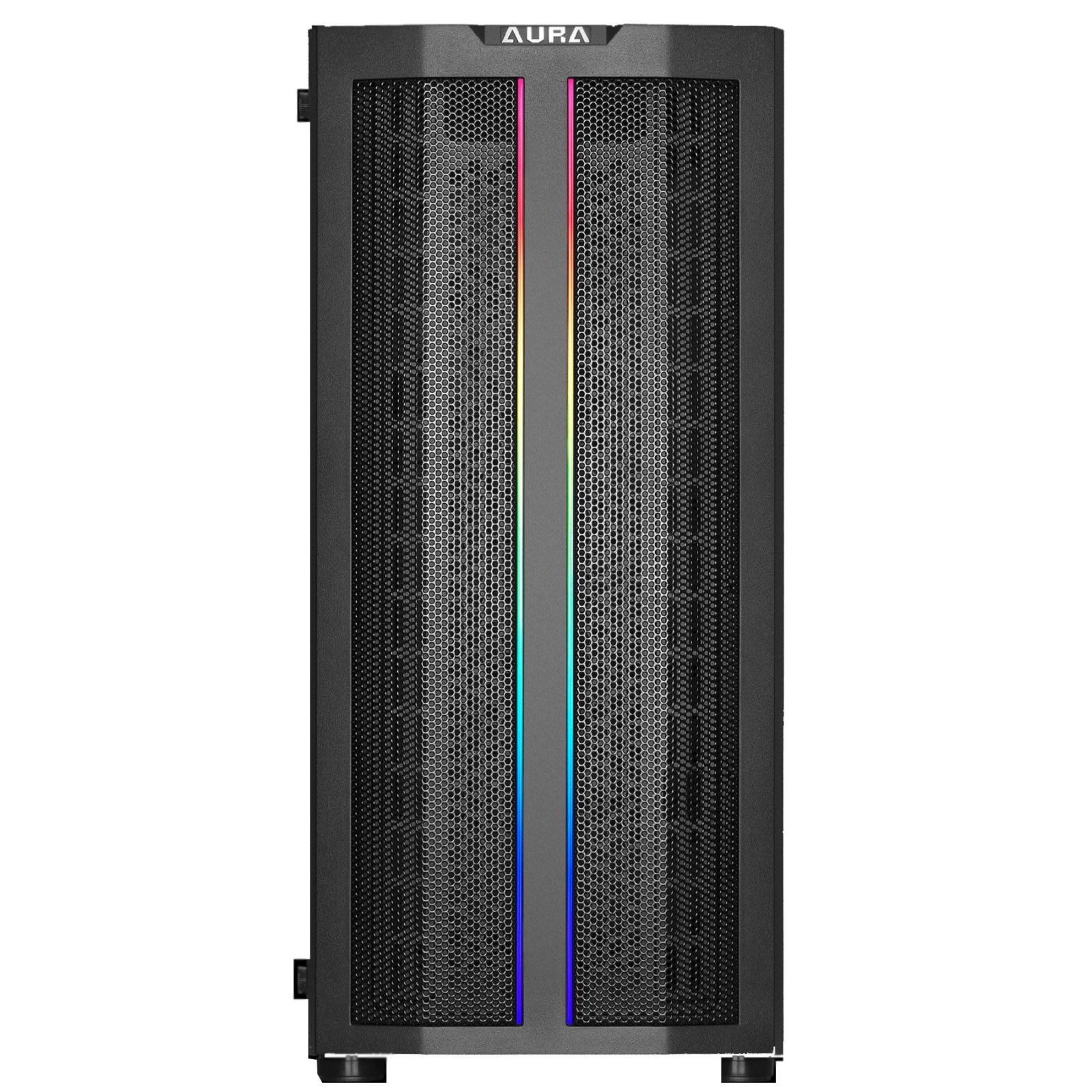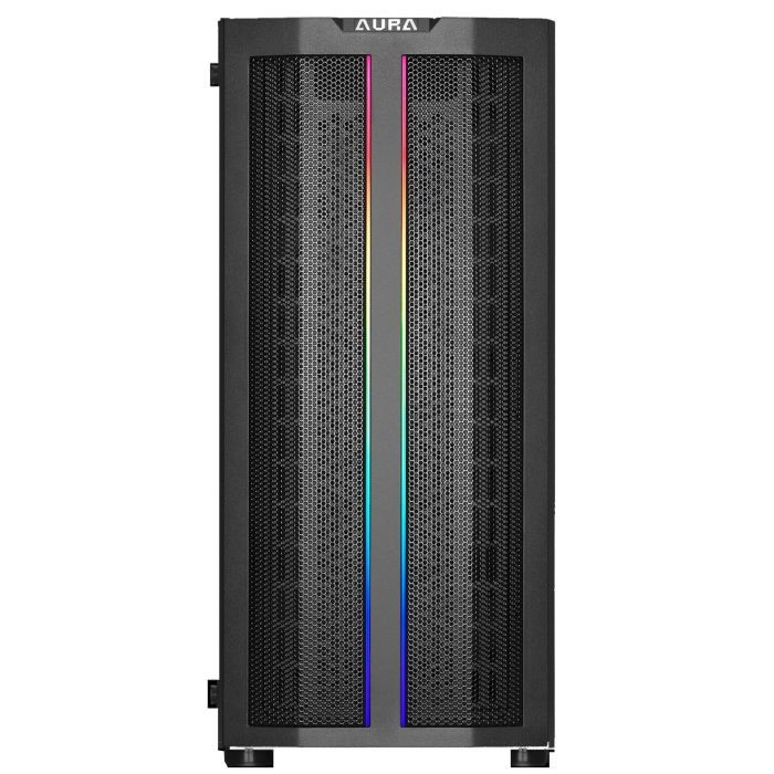 AURA GC3 оснащений передньою сітчастою панеллю, має гладкий зовнішній вигляд і чудову внутрішню вентиляцію. Корпус має подвійні світлові смуги на передній панелі з увімкненим вентилятором ARGB, щоб створити характерне відчуття RGB. Продемонструйте всю внутрішню красу вашої системи із панорамним загартованим склом, яке легко встановлюється без інструментів.