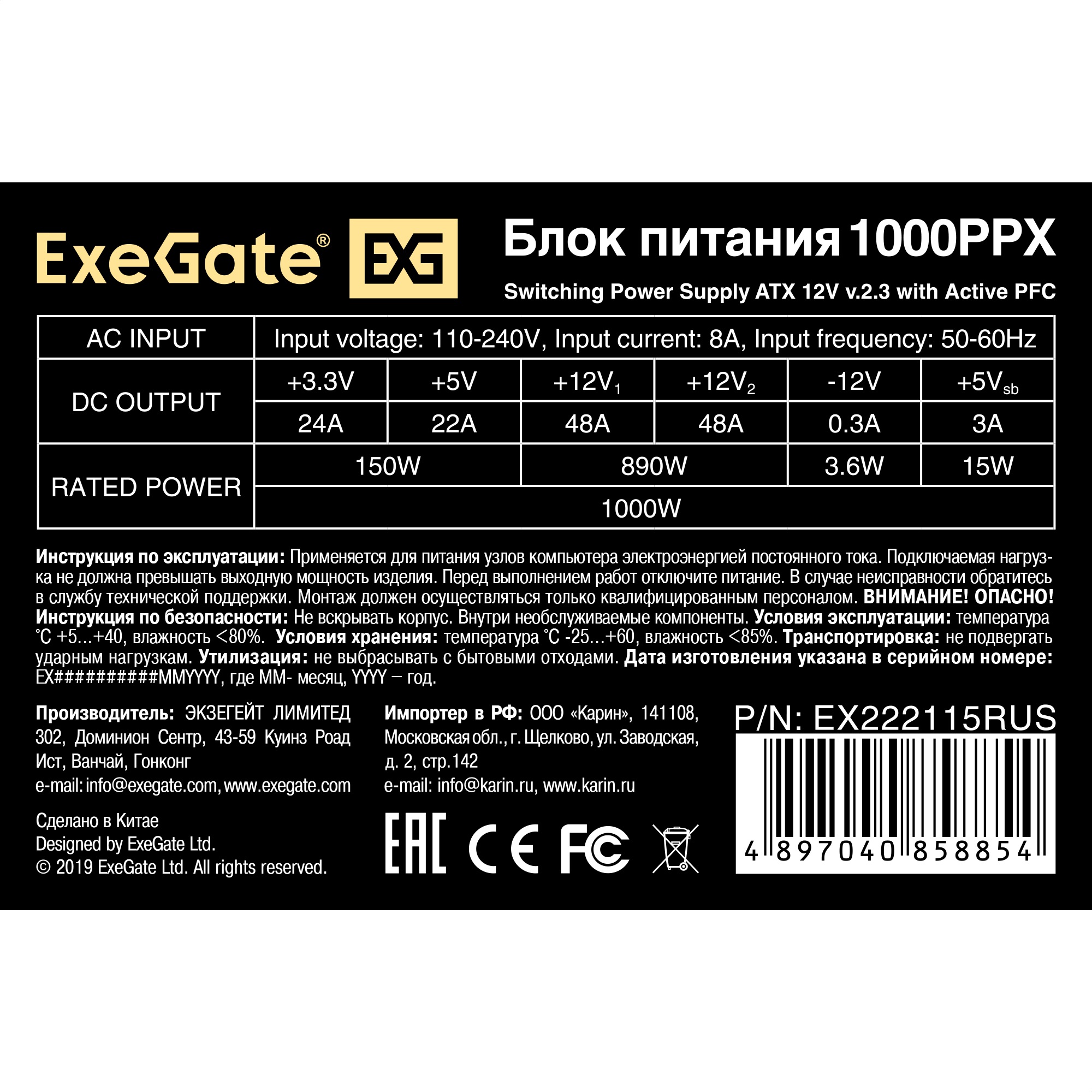 С витрины! Блок питания 1000W ExeGate 1000PPX (ATX, APFC, КПД 82% (80 PLUS), 14cm fan, 24pin, 2x(4+4)pin, 6xPCIe, 8xSATA, 4xIDE, Cable Management, black, RTL)