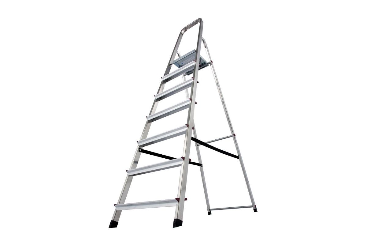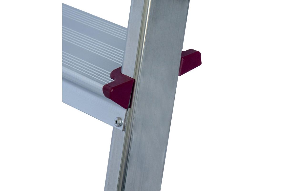 Практичная лестница для работ на высоте 2.85 м. Алюминиевая конструкция не подвержена коррозии и отличается долговечностью. Наверху располагается высокая дуга безопасности. На ней есть лоток для инструментов и крюк для ведра. Наконечники на опорах обеспечивают лестнице надежное положение во время работы.