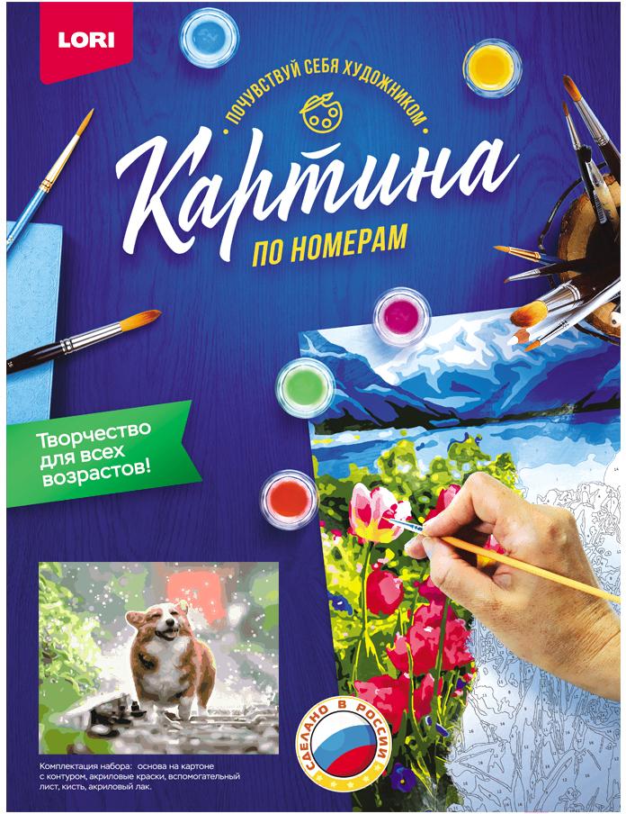 - Комплектация набора контрольный лист (вспомогательный), холст, краски (акриловые — 22 цв.), кисти (2 шт.), лак (акриловый)
