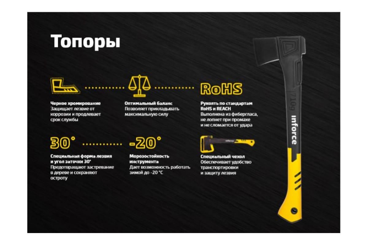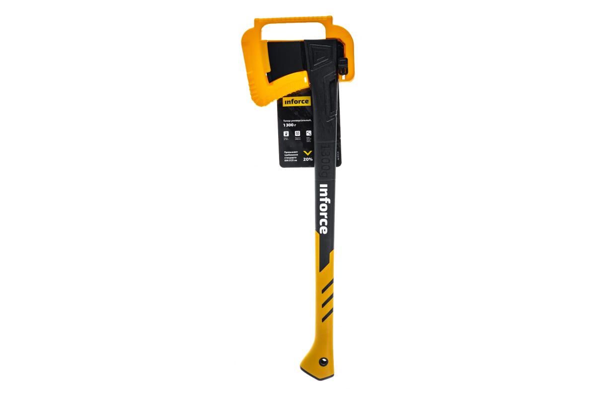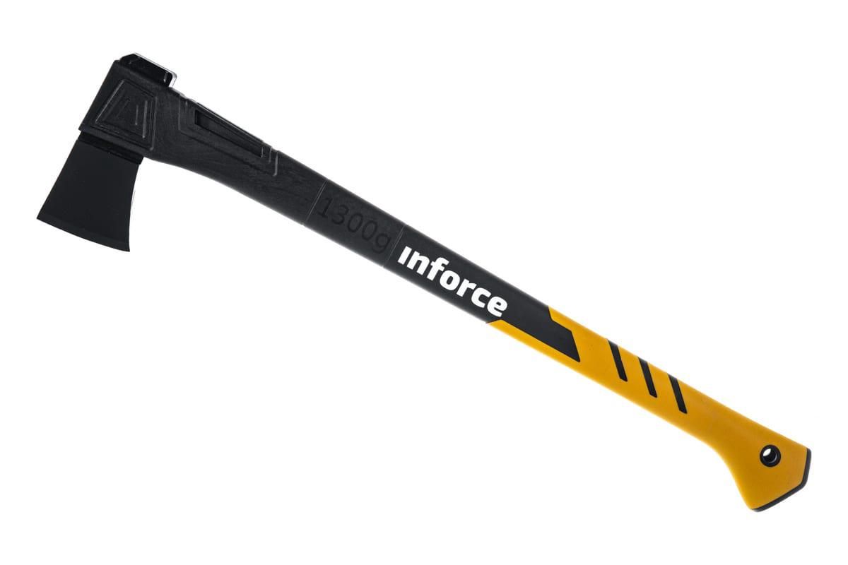 Универсальный топор 1300 г Inforce 06-12-20 обладает значительным весом, что увеличивает энергию удара и позволяет эффективно раскалывать и тесать древесину.