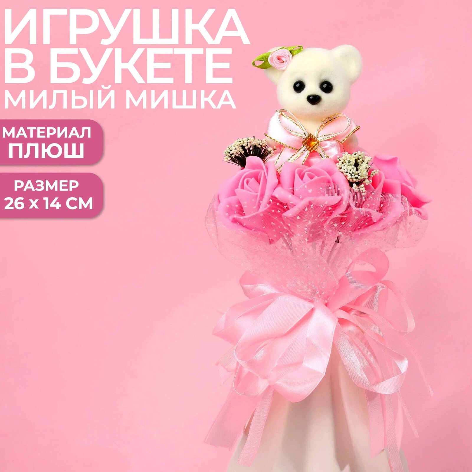 Букет «Для тебя», с мишкой, 7 цветков, цвет бело-розовый, 14 см х 14 см х 26 см