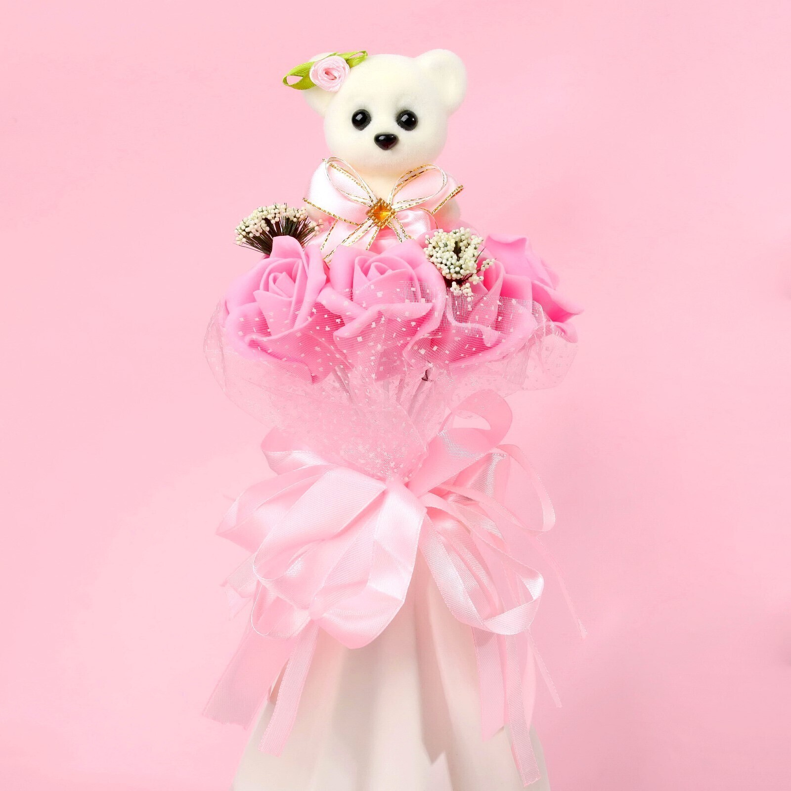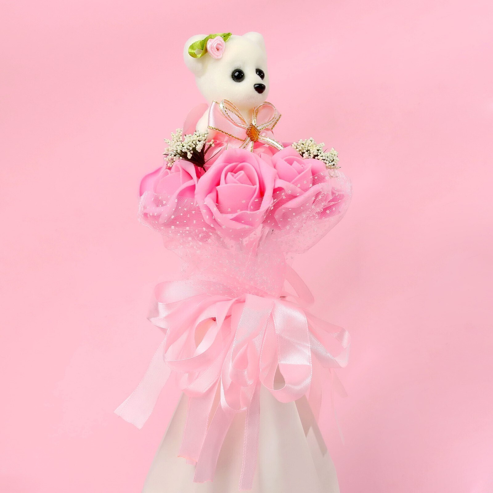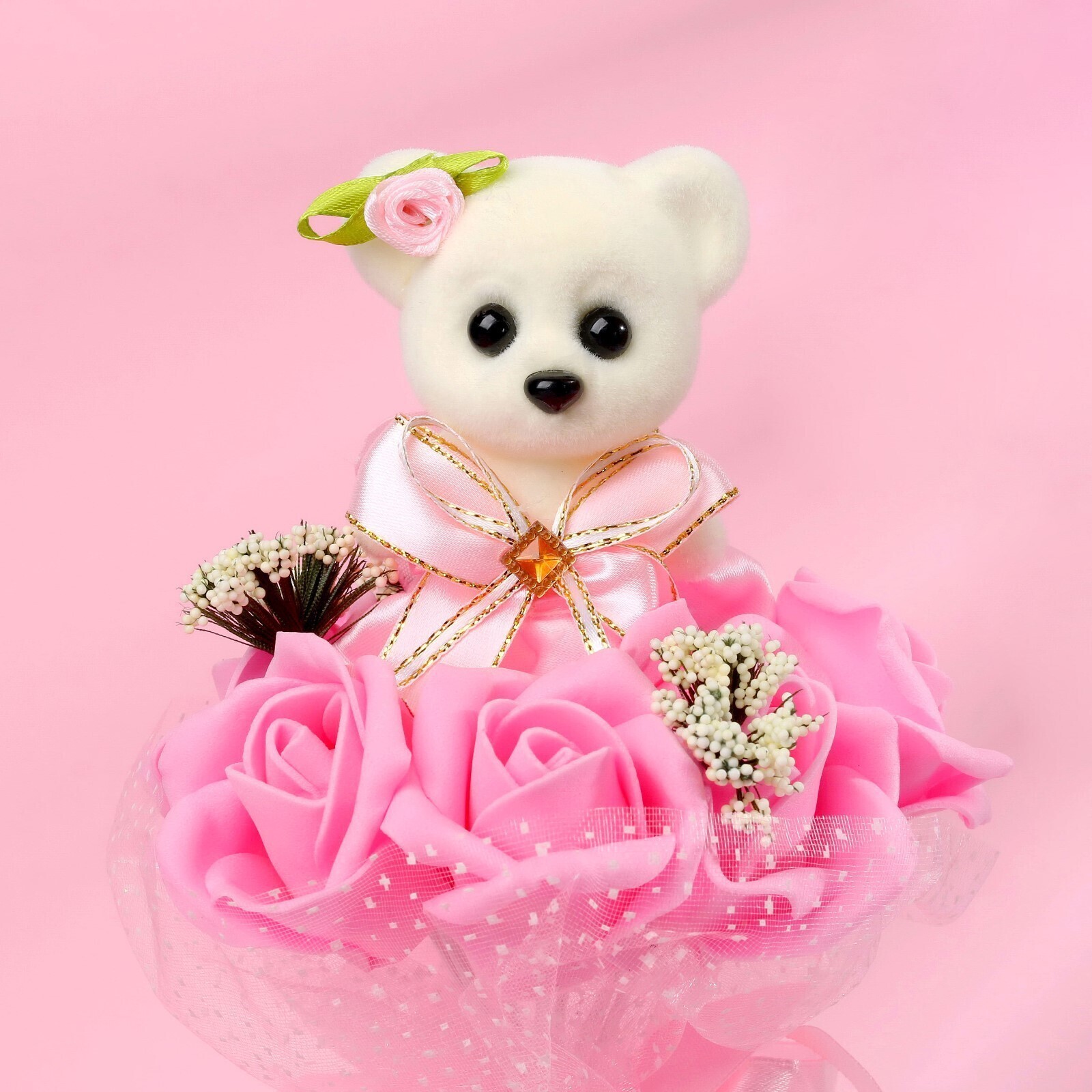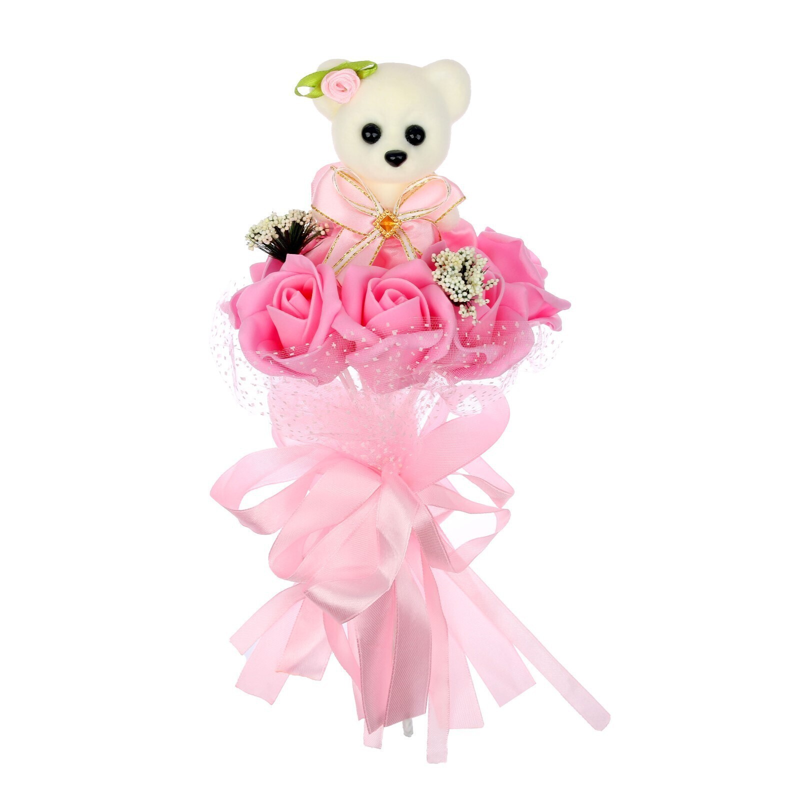 Букет «Для тебя», с мишкой, 7 цветков, цвет бело-розовый, 14 см х 14 см х 26 см — красивый, яркий и приятный на ощупь сувенир. Преподнесите очаровательную игрушку как самостоятельный подарок на свадьбу, девичник, 14 Февраля или день рождения, и счастливая обладательница не останется равнодушной. Используйте аксессуар как букет-дублёр, а после торжества он украсит любой интерьер, ведь чудесные цветы не завянут и не помнутся.