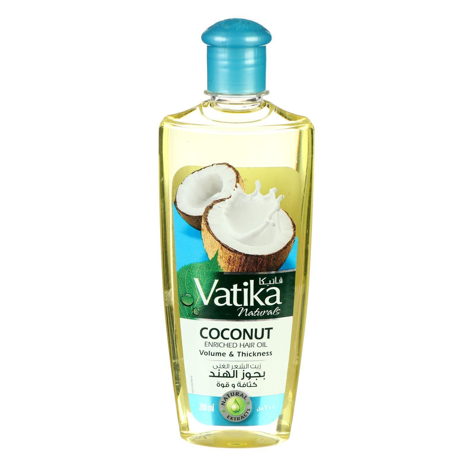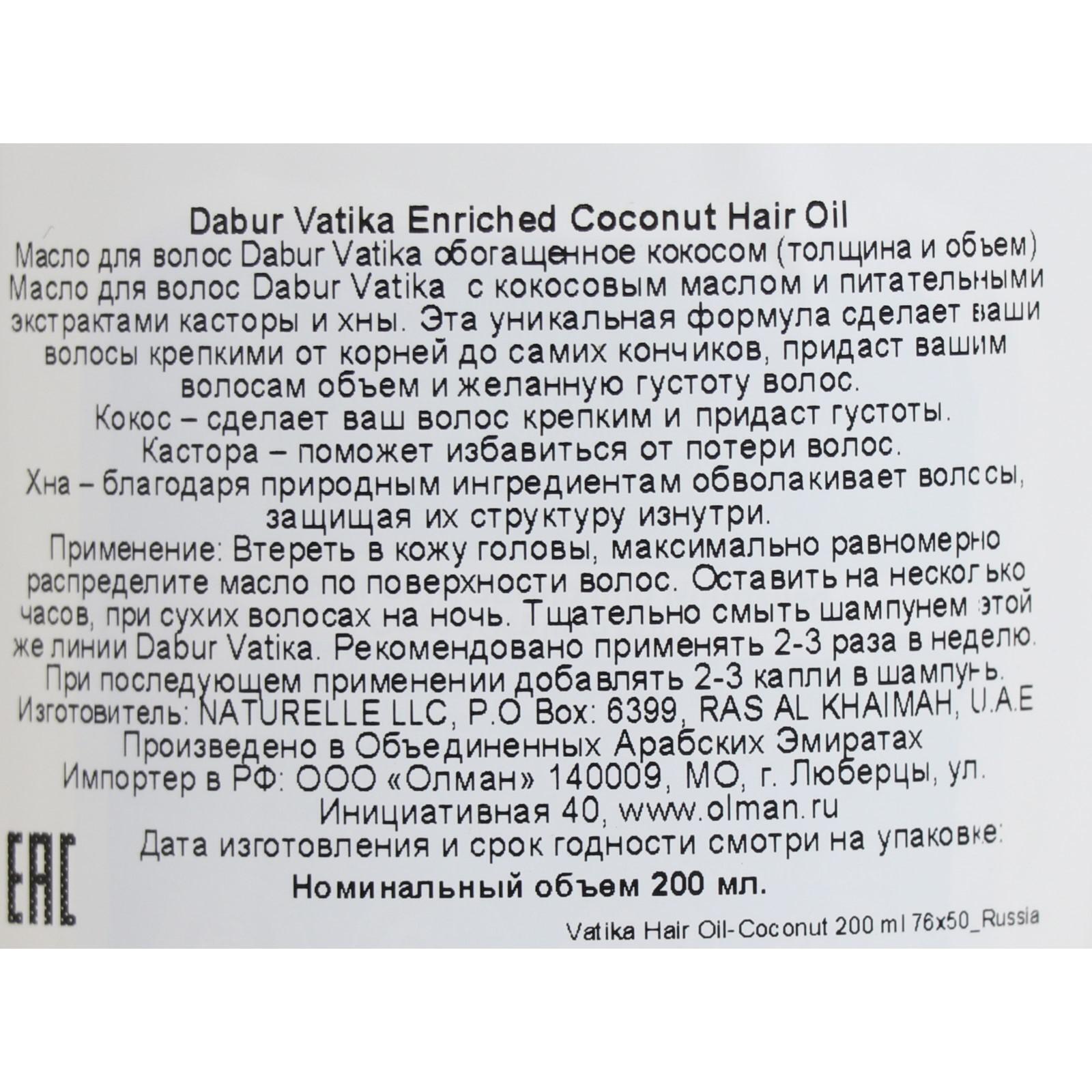 Масло для волос Dabur VATIKA Coconut Enriched обогащённое Кокосом содержит питательные экстракты кокоса, касторы, хны, амлы и лимона. Эта уникальная формула сделает ваши волосы крепкими от корней до самих кончиков, придаст вашим волосам объем и желанную густоту. Масло питает, укрепляет и защищает волосы, устраняя многие проблемы (зуд, перхоть, ломкость и т. д.) Кокос – сделает ваш волос крепким и придаст объем. Кастора – поможет избавится от потери волос. Хна – благодаря природным ингредиентам обволакивает волос, защищая его структуру и кондиционирует волос.