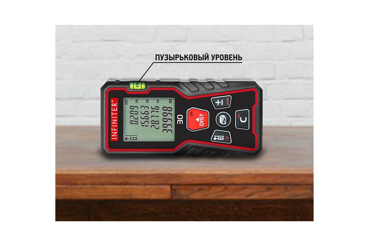 - Еще одно весомое преимущество лазерного дальномера INFINITER 30 - наличие пузырькового уровня. Для получения наиболее верных результатов измерений, расположение прибора должно быть максимально горизонтальным относительно измеряемой поверхности. Горизонтирование легко и точно контролируется пузырьковым уровнем. Используя INFINITER 30 в работе, вы можете быть уверены в корректности измерений;