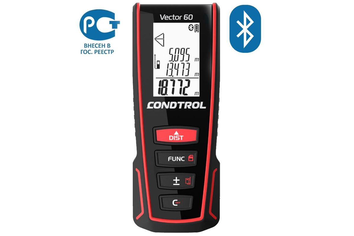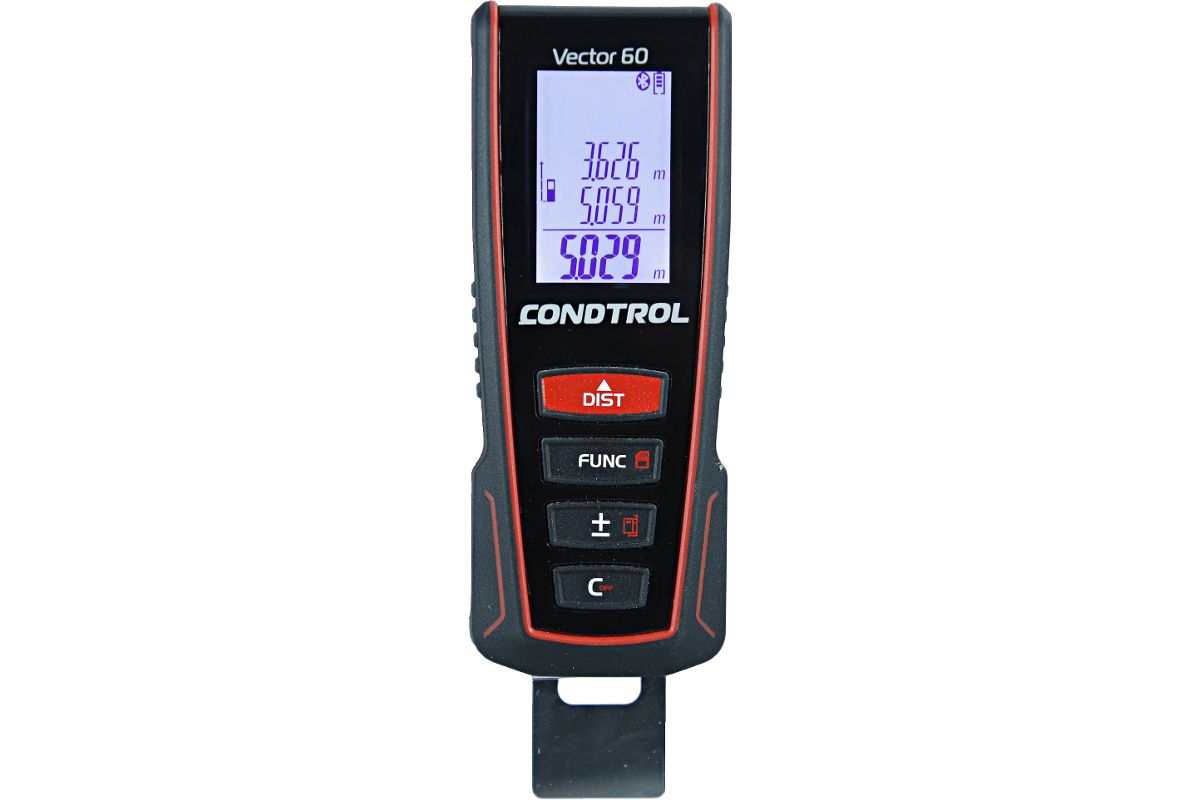CONDTROL Vector 60 – лазерный дальномер с дальностью измерений до 60 м. Поможет замерить расстояние, вычислить площадь или объём. Выполняет косвенные измерения с помощью теоремы Пифагора. Точность – ± 1,5 мм.