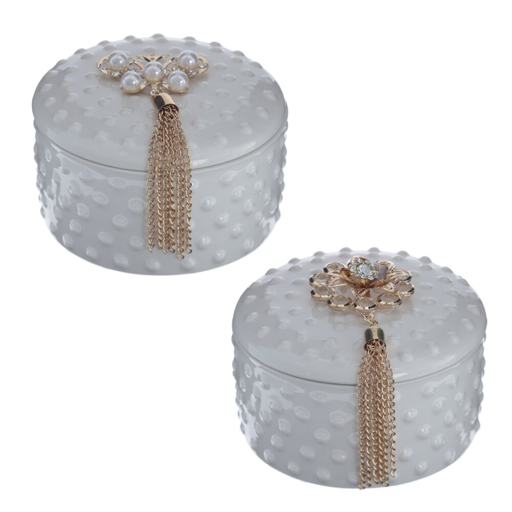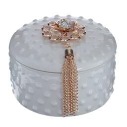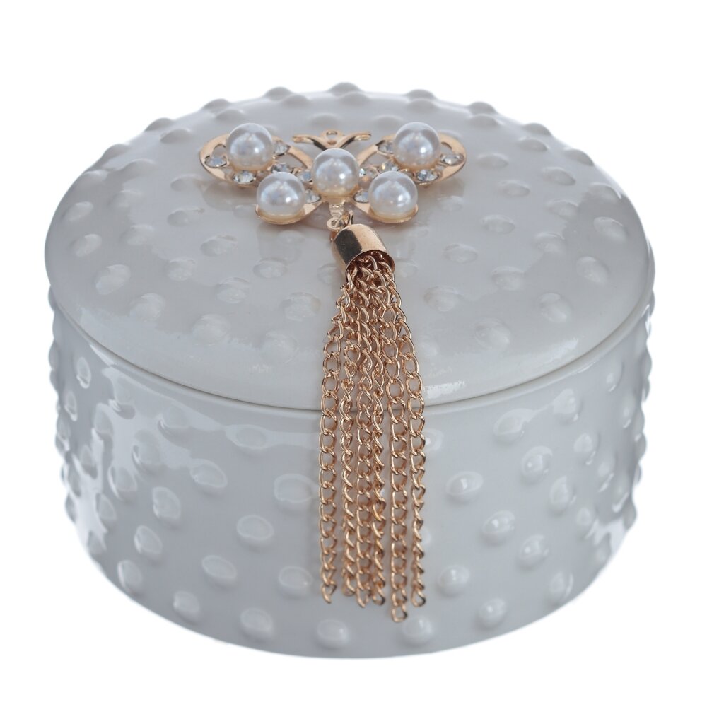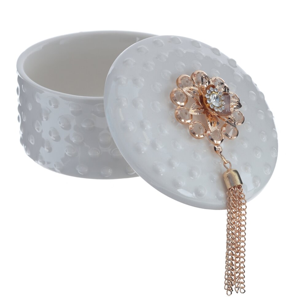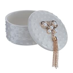Фарфоровая маленькая шкатулка круглой формы с декором на крышечке. Подарить изделие можно прекрасной девушке, женщине, маме, бабушке, подруге или сестренке. В изящной фарфоровой шкатулке принято хранить самые ценные украшения или драгоценности, к примеру, обручальные кольца молодоженов. Представлена в двух вариантах.