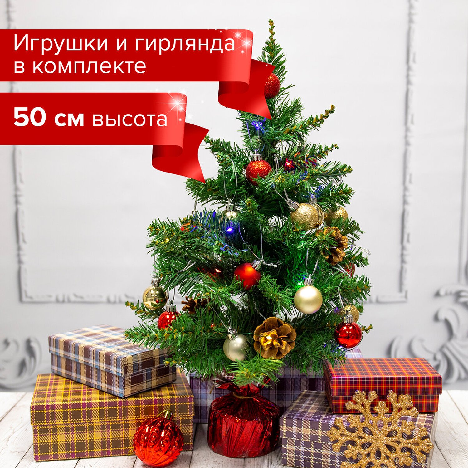Новогодняя елка Золотая сказка искусственная декоративная 50 см зеленая с гирляндой и игрушками 591316