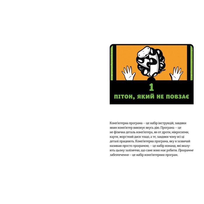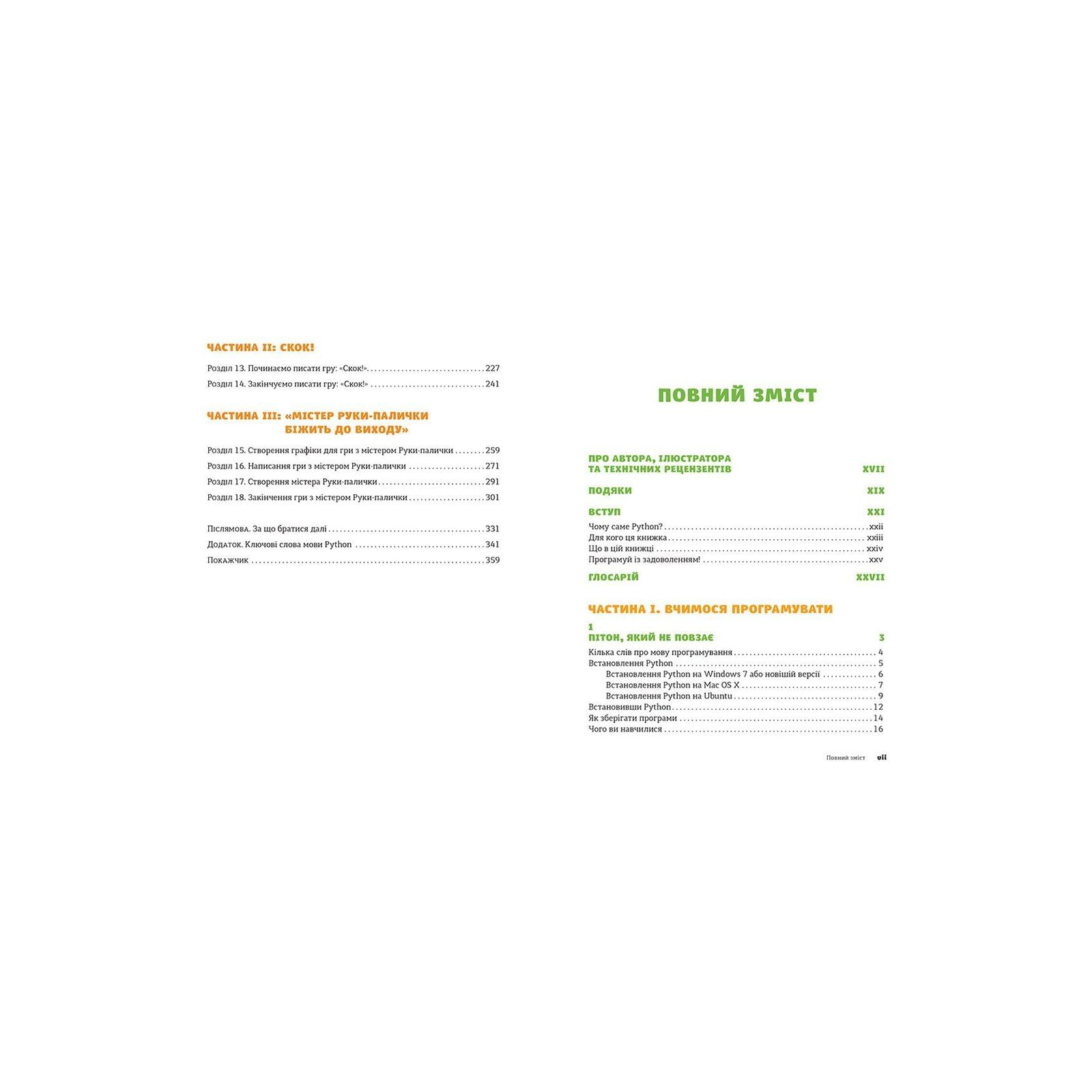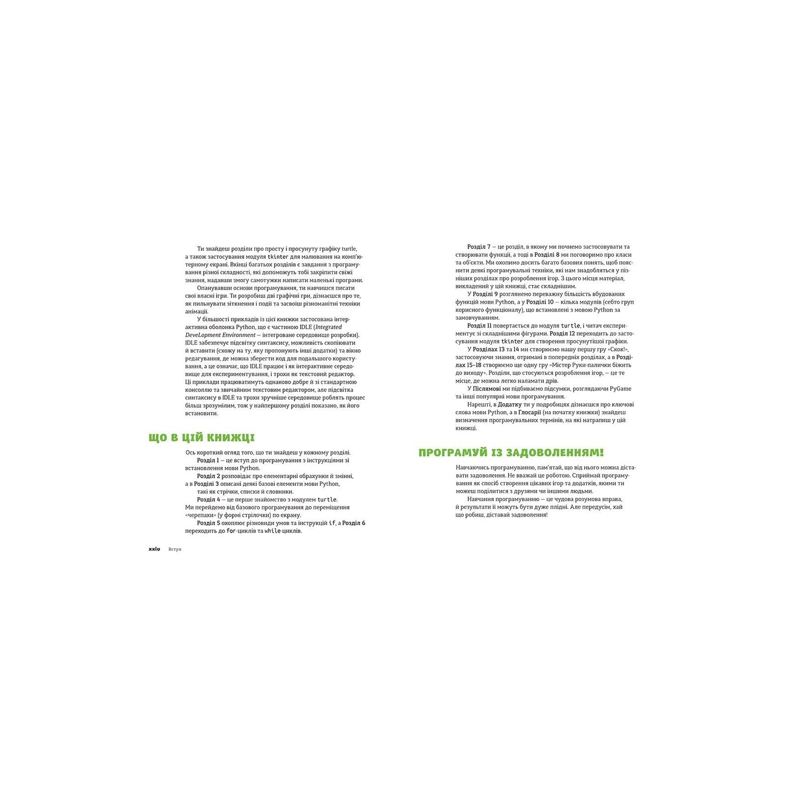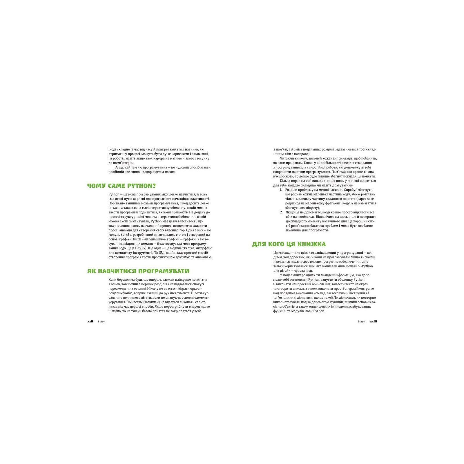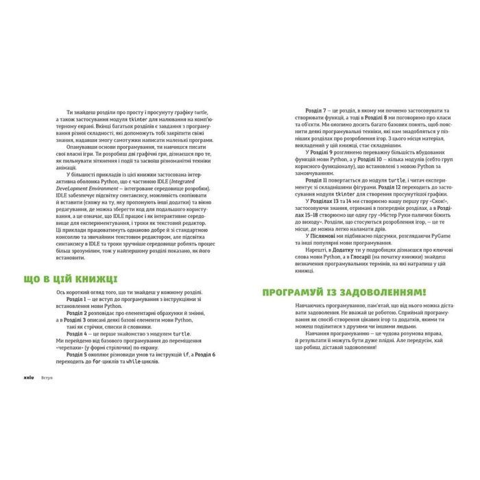 Навчіться використовувати основні елементи цієї мови — списки, функції, модулі, малювати вбудованими інструментами Python та анімувати зображення і навіть зможете написати дві справжні комп'ютерні ігри: іграшку з м'ячем «Скок» та бродилку «Містер Руки-палички біжить до виходу».