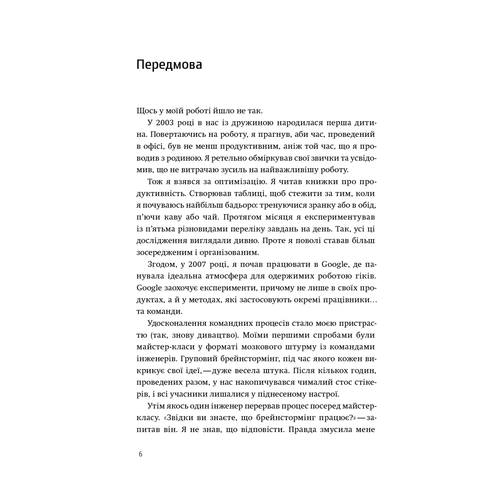 Автори не тільки до деталей розписують майже кожну годину з п’яти днів спринту, а й пояснюють, чому не працює брейнстормінг, як уникнути пасток у звичних процесах прийняття рішень, а також як адаптувати технологію спринту для будь-якої компанії, неприбуткової організації і навіть університетської аудиторії.