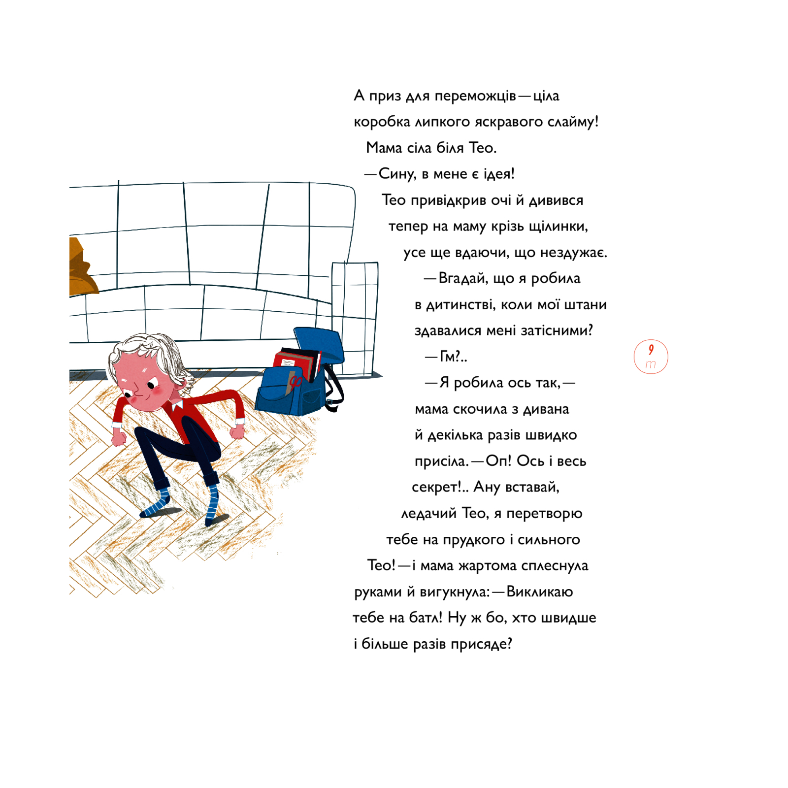 Це весела і зворушлива історія для дітей про біг, любов, дружбу, підтримку, про пізнання себе та навколишнього світу. Головний герой Тео не вміє сидіти на місці і найдужче любить бігати. Точнісінько, як його мама, для якої біг – невід’ємна частина життя. Тео знає багато про бігунів, та все ж, коли він готується взяти участь у дитячому забігу, в його голові зринає безліч запитань. Що потрібно для того, аби стати чемпіоном? Як навчитися завжди бути першим? А головне – як і коли відкрити мамі свою таємницю, яка пояснить, чому ж він такий «непосидючка»?..