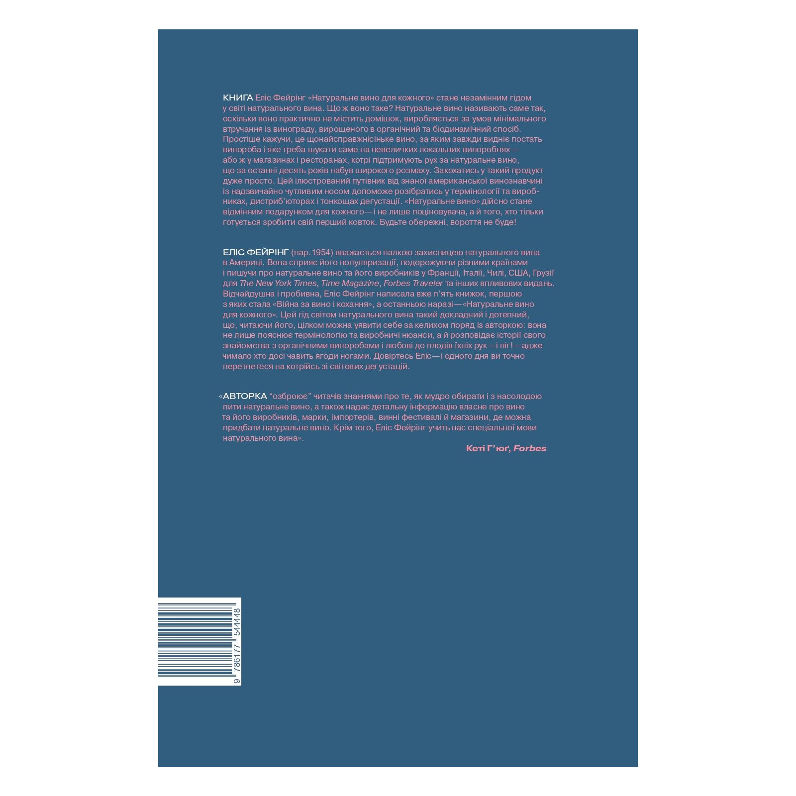 Книга Еліс Фейрінг «Натуральне вино для кожного» стане незамінним гідом у світі натурального вина. Що ж це таке? Натуральне вино практично не містить домішок, виготовляється за умов мінімального втручання із винограду, вирощеного в органічний та біодинамічний спосіб. Простіше кажучи, це щонайсправжнісіньке вино, за яким завжди видніє постать винороба і яке найлегше знайти саме на локальних виноробнях – або ж у магазинах і ресторанах, котрі підтримують рух за натуральне вино, котрий за останні десять років набув надзвичайно широкого розмаху. Закохатись у такий продукт надзвичайно просто. Цей ілюстрований путівник від знаної американської винознавчині із надзвичайно чутливим носом допоможе розібратись у термінології та виробниках, дистриб’юторах і тонкощах дегустації.