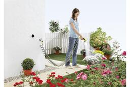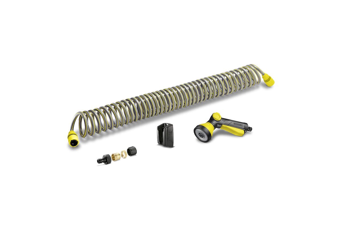 Комплект со спиральным шлангом. 10-метровый шланг, мультифункциональный пистолет, коннектор с аквастопом и защитой от перегиба, коннектор без аквастопа с защитой от перегиба, адаптер для крана G3/4, штуцер для внутридомового крана и настенный держатель. Идеальное решение для полива растений в палисадниках, на балконах или террасах, содержит все, что вам может понадобиться для регулярных работ по поливу. Благодаря использованию многофункционального распылителя даже стойкие загрязнения могут быть легко удалены с садовых инструментов и других подобных предметов. Спиральный шланг возвращается в компактную форму после каждого использования и может быть убран на настенный кронштейн, не занимая много места. Адаптер для крана в комплекте позволяет подключить спиральный шланг к кухонному крану.