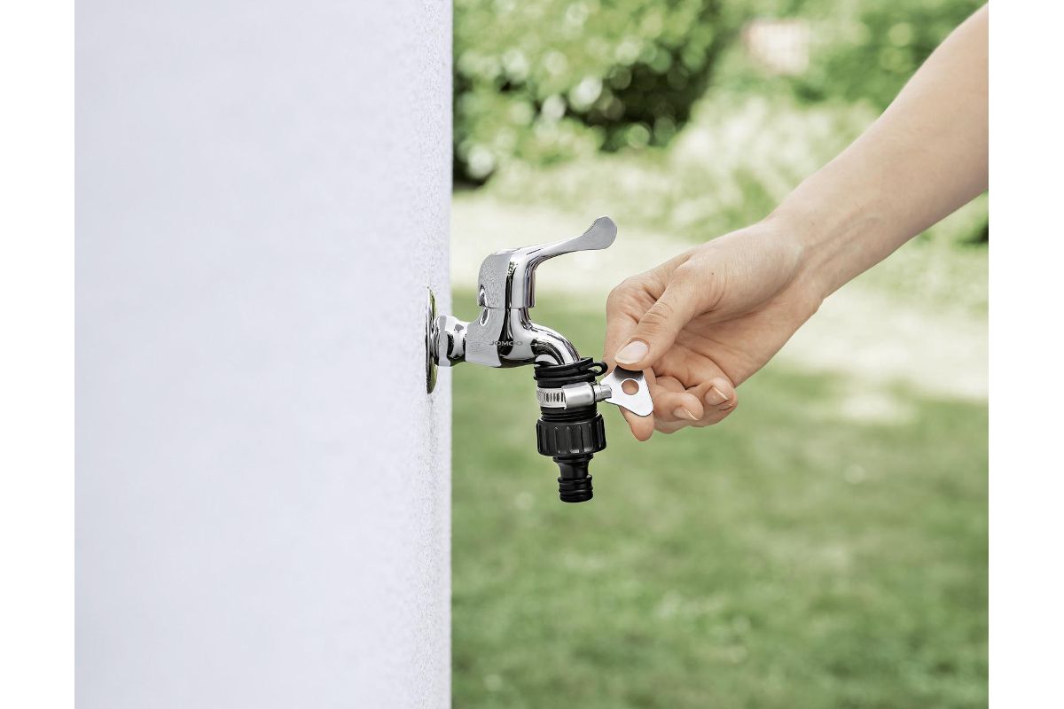 Два коннектора - с аквастопом и без. При использовании аквастопного коннектора, вода не будет литься при включенной насосной станции, пока вы разматываете шланг к месту полива.