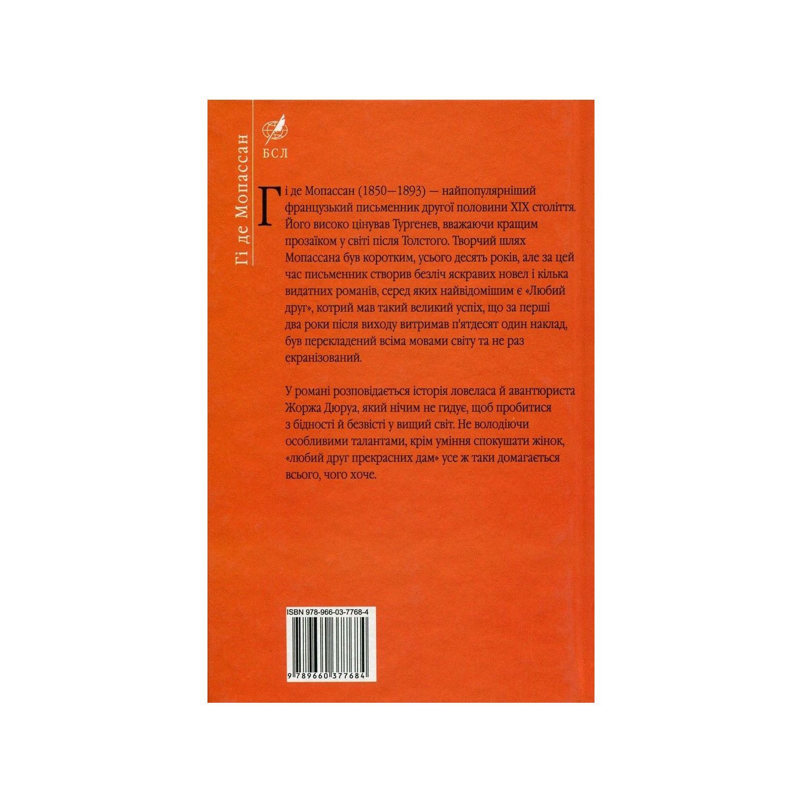 Гі де Мопассан (1850-1893) - найпопулярніший французький письменник другої половини ХІХ століття. Його високо цінував Тургенєв, вважаючи кращим прозаїком у світі після Толстого. Творчий шлях Мопассана був коротким, усього десять років, але за цей час письменник створив безліч яскравих новел і кілька видатних романів, серед яких найвідомішим є "Любий друг", котрий мав такий великий успіх, що за перші два роки після виходу витримав п'ятдесят один наклад, був перекладений всіма мовами світу та не раз екранізований.