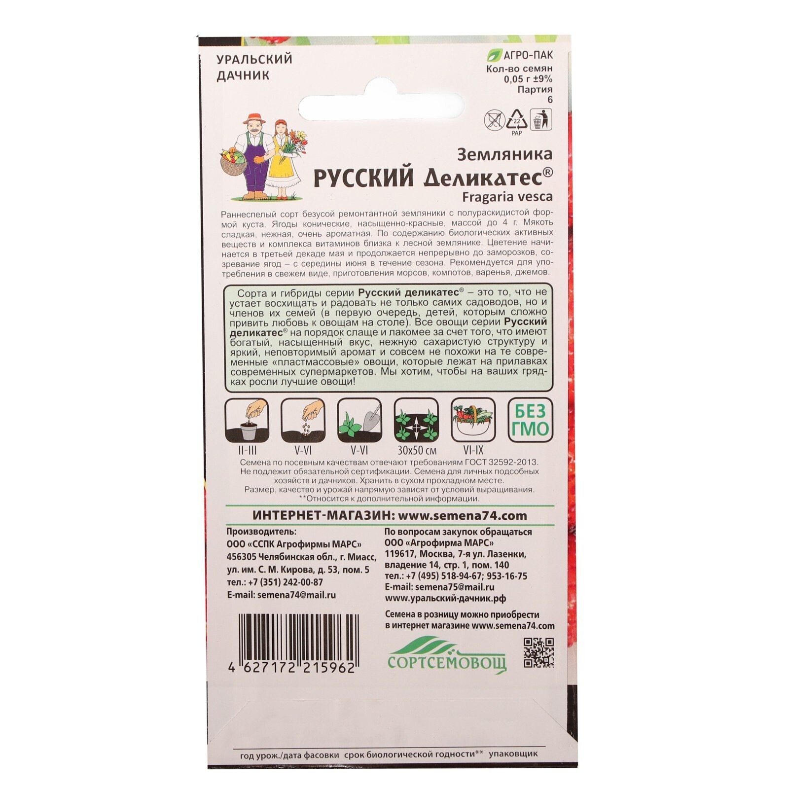 Раннеспелый сорт безусой ремонтантной земляники с полураскидистой формой куста. Ягоды конические, насыщенно-красные, массой до 4 г. Мякоть сладкая, нежная, очень ароматная. По содержанию биологических активных веществ и комплекса витаминов близка к лесной землянике. Цветение начинается в третьей декаде мая и продолжается непрерывно до заморозков, созревание ягод - с середины июня в течение сезона. Рекомендуется для употребления в свежем виде, приготовления морсов, компотов, варенья, джемов.