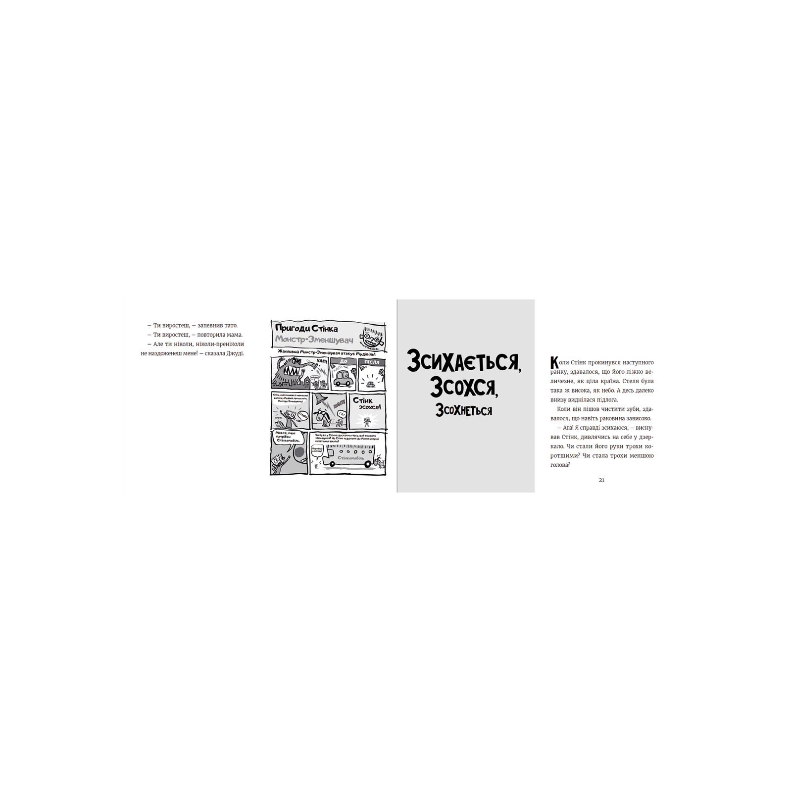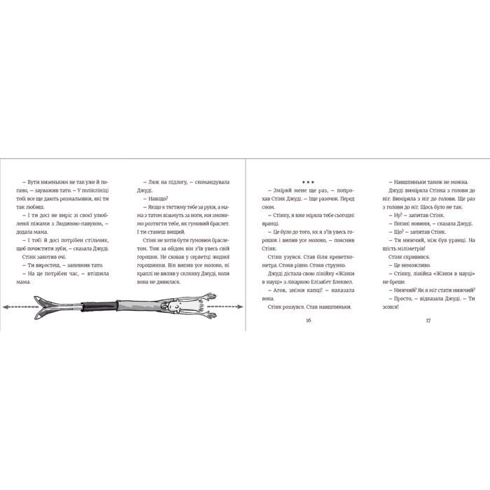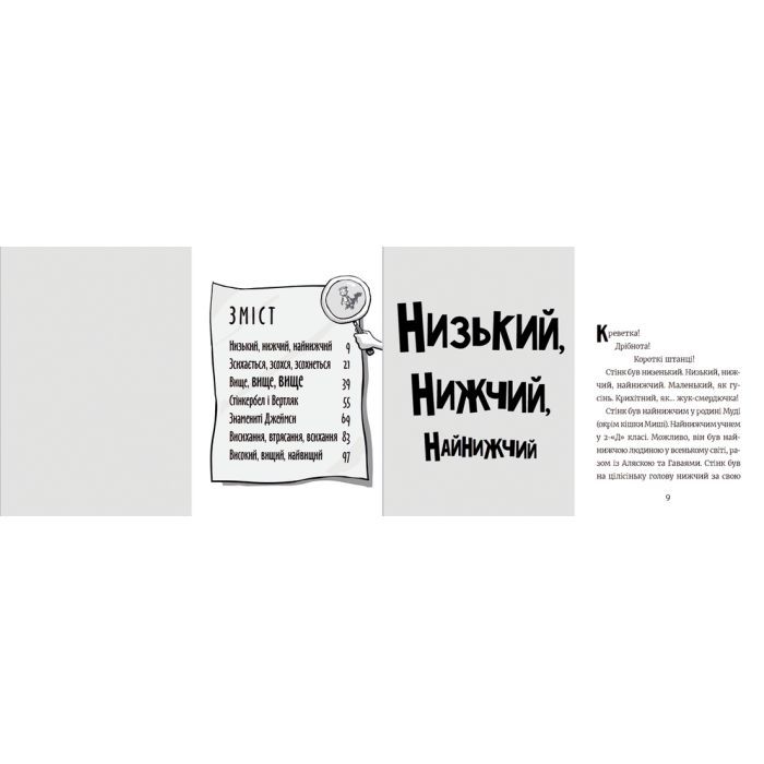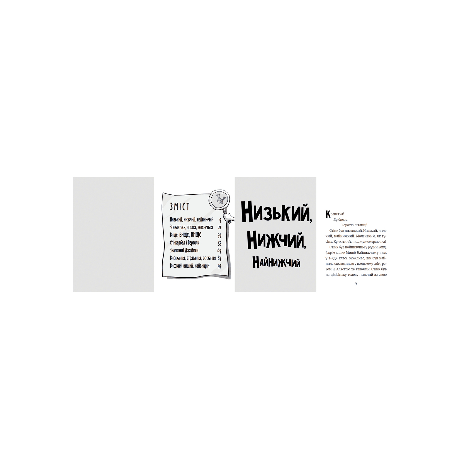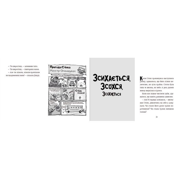 Стінк – найнижчий у своїй сім’ї. Найнижчий у класі. Можливо, найнижчий хлопчик у всьому світі. Він змушує свою сестру Джуді щоранку вимірювати його зріст. Стінк готовий на все, що завгодно, навіть їсти горошок і пити молоко, аби лиш хоч трішки підрости. Та Джуді виявляє, що він не росте, а… зсихається! Що ж тепер робити бідному Стінкові?