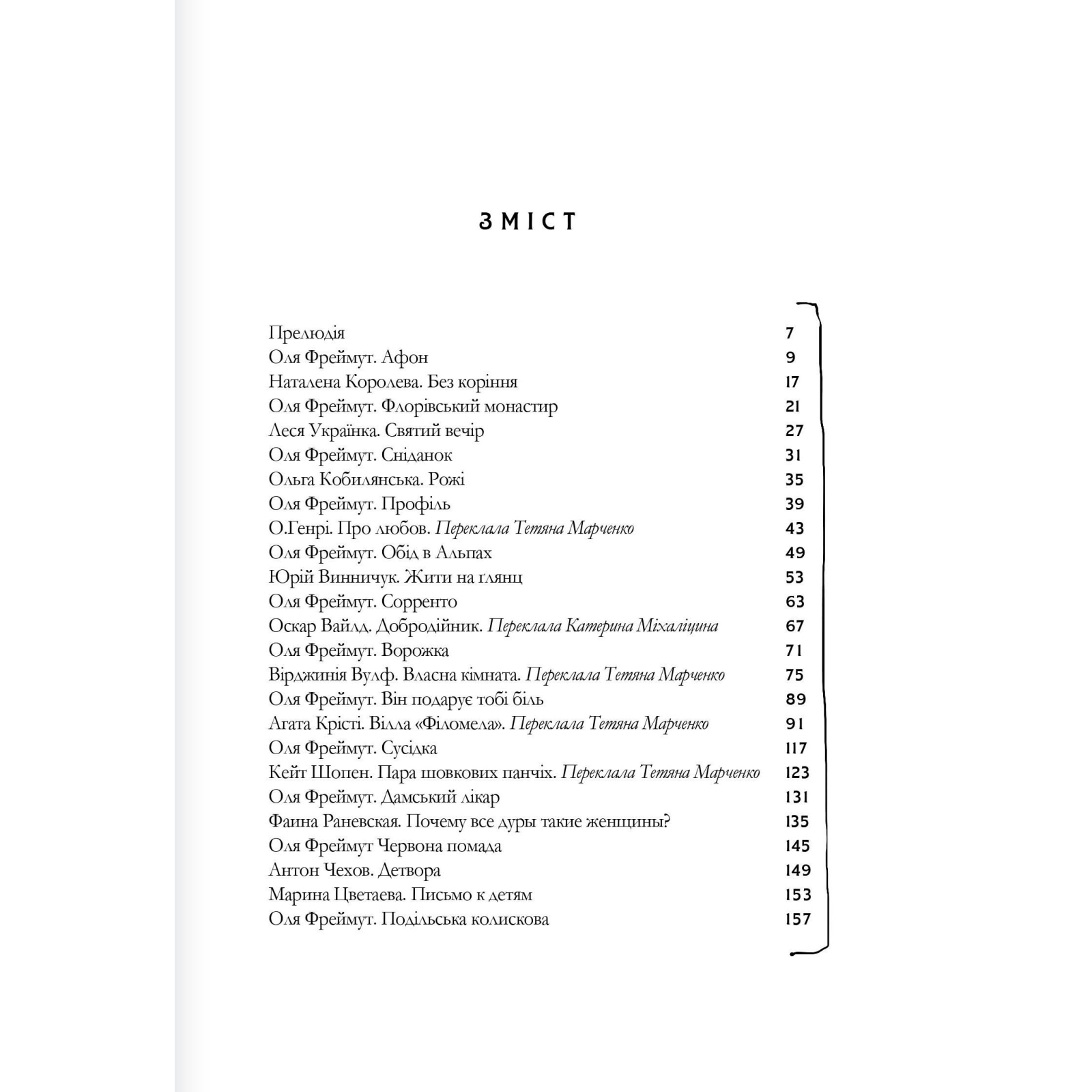 До збірки ввійшли унікальні твори Ольги Кобилянської, Фаіни Раневської, Лесі Українки, Юрія Винничука, Наталени Королеви, Марини Цвєтаєвої та Антона Чехова. Вперше перекладено і представлено українською малознані твори О. Генрі, Оскара Вайлда, Вірджинії Вулф та Кейт Шопен, яка писала у 1900-х роках для американського «Vogue».