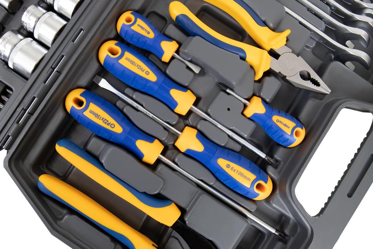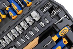 Набор инструмента 1/2 Dr и 1/4 Dr 56 предметов KRAFT KT 700303 обеспечивает удобство работы с крепежом. Наличие шестигранных головок делает более безопасным монтаж и демонтаж автомобильных болтов.