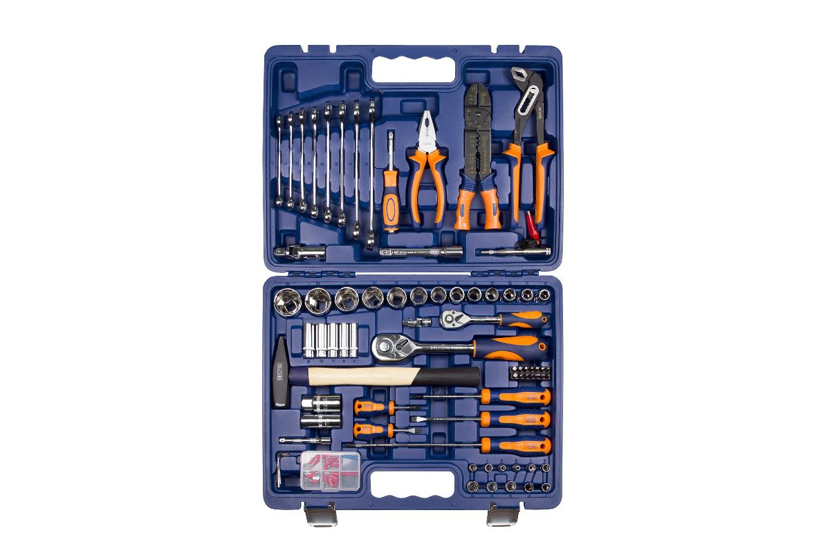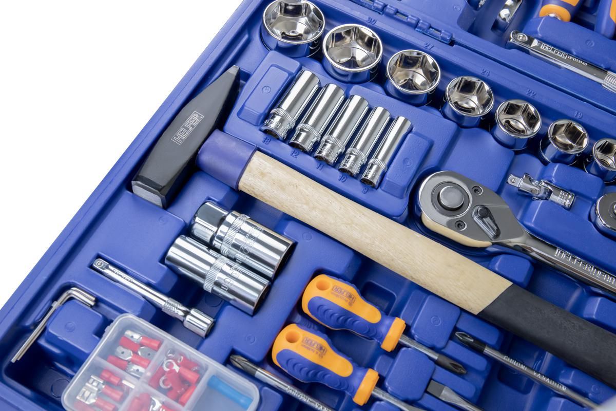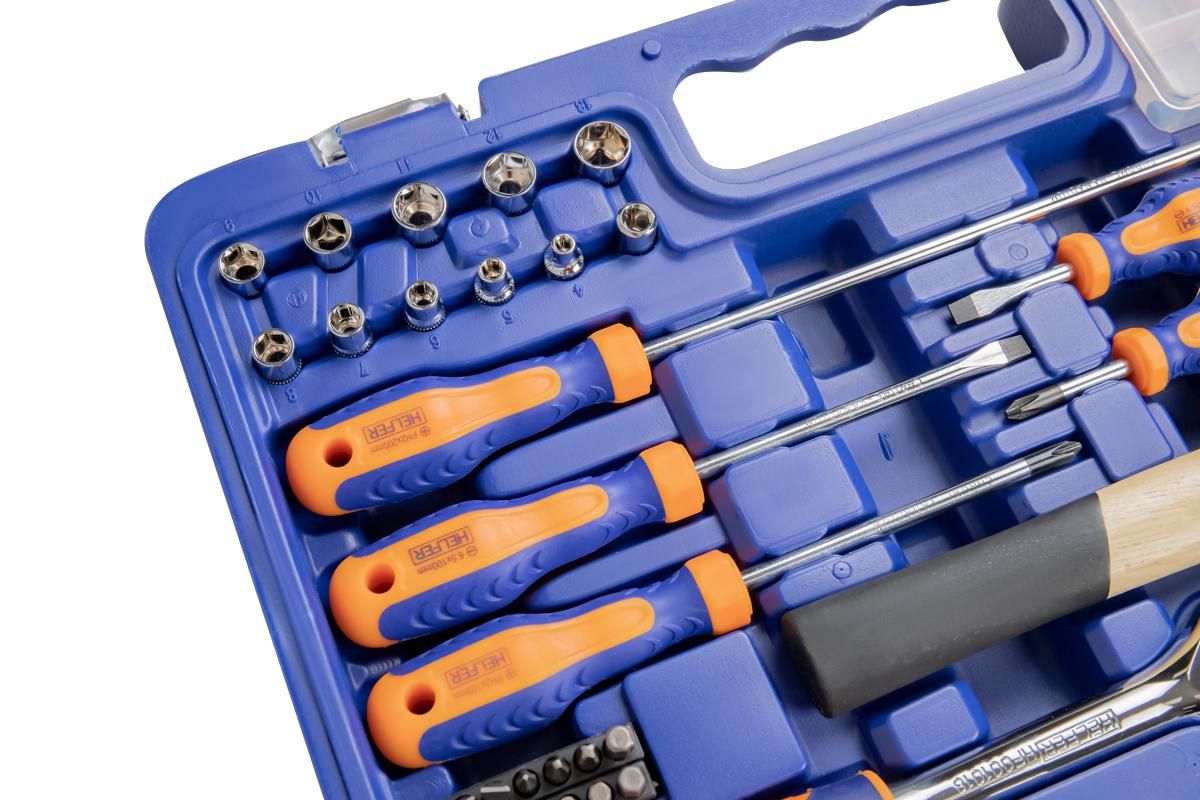 Универсальный набор инструмента от HELFER серии COMFORT 99 предметов - оптимальный комплект деталей, необходимых для выполнения монтажных, слесарных и ремонтных задач. Незаменимы как для автолюбителя, так и в профессионалов: в автосервисах и мастерских.