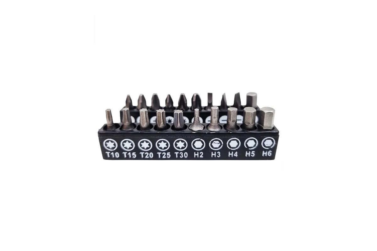 - Набор бит 25мм: PH1, PH2, PH3, PZ1, PZ2, PH3, PL3, SL4, SL5, H2, H3, H4, H5, H6, T10, T15, T20, T25, T30;