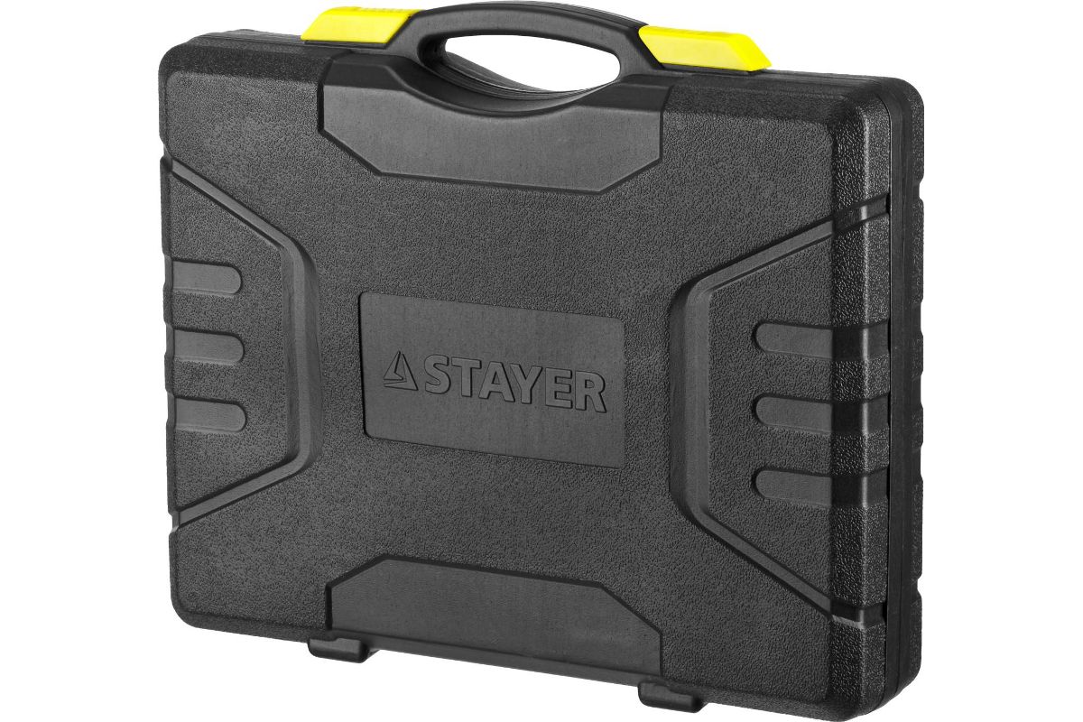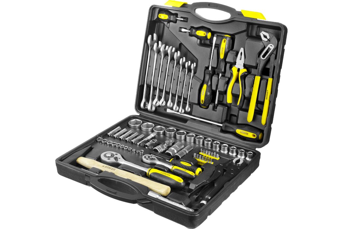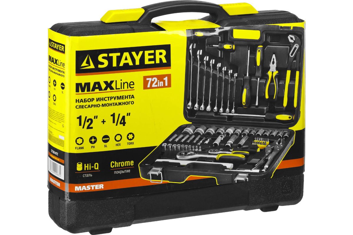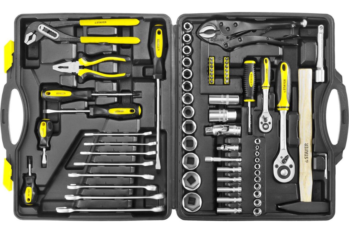 STAYER 27760-H72 – универсальный автомобильный набор инструментов для ремонта автомобиля, мотоцикла или велосипеда. Включает в себя 72 предмета. Вес 7 кг. Пригодится дома, на даче, в частной мастерской или гараже.