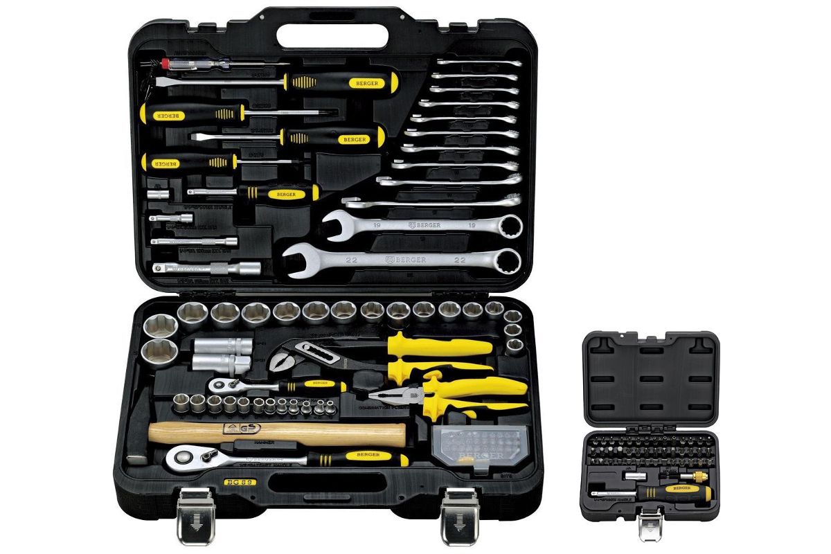 В состав набора входят: Набор инструментов BERGER BG089-1214 89 предметов, Набор бит BERGER BG-45SB ручка+биты 45 предметов в кейсе