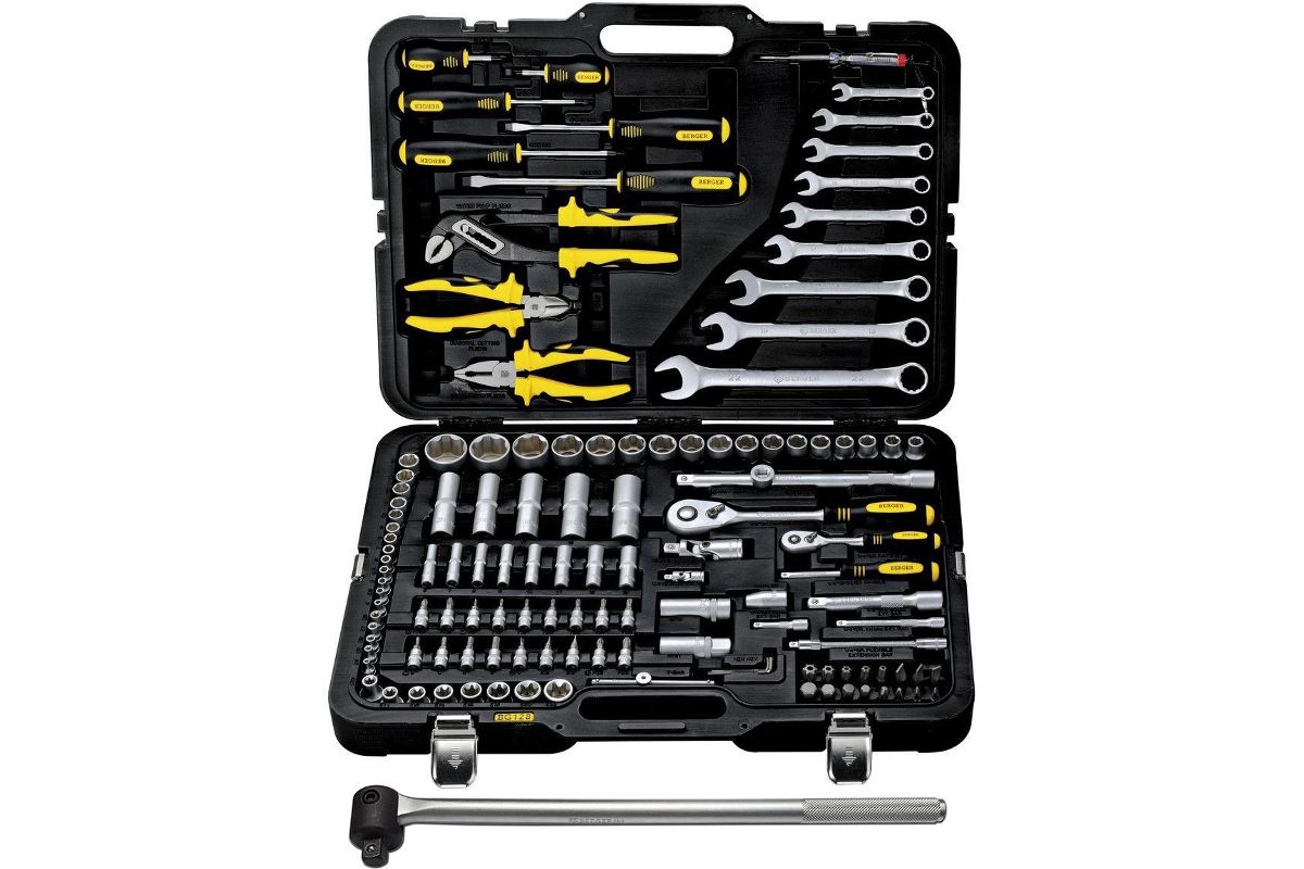 В состав набора входят: Набор инструментов BERGER BG128-1214 128 предметов, Вороток BERGER BG2285 1/2'' с усиленным шарниром 430 мм