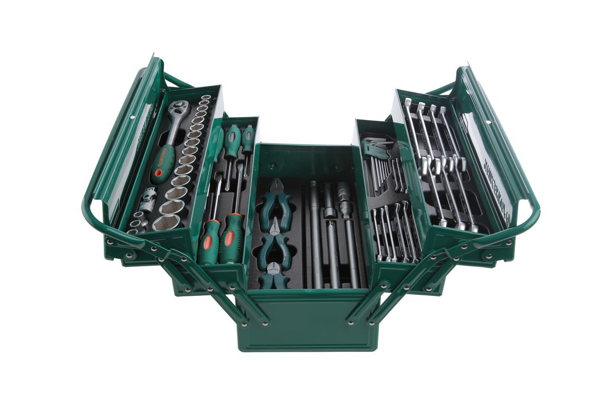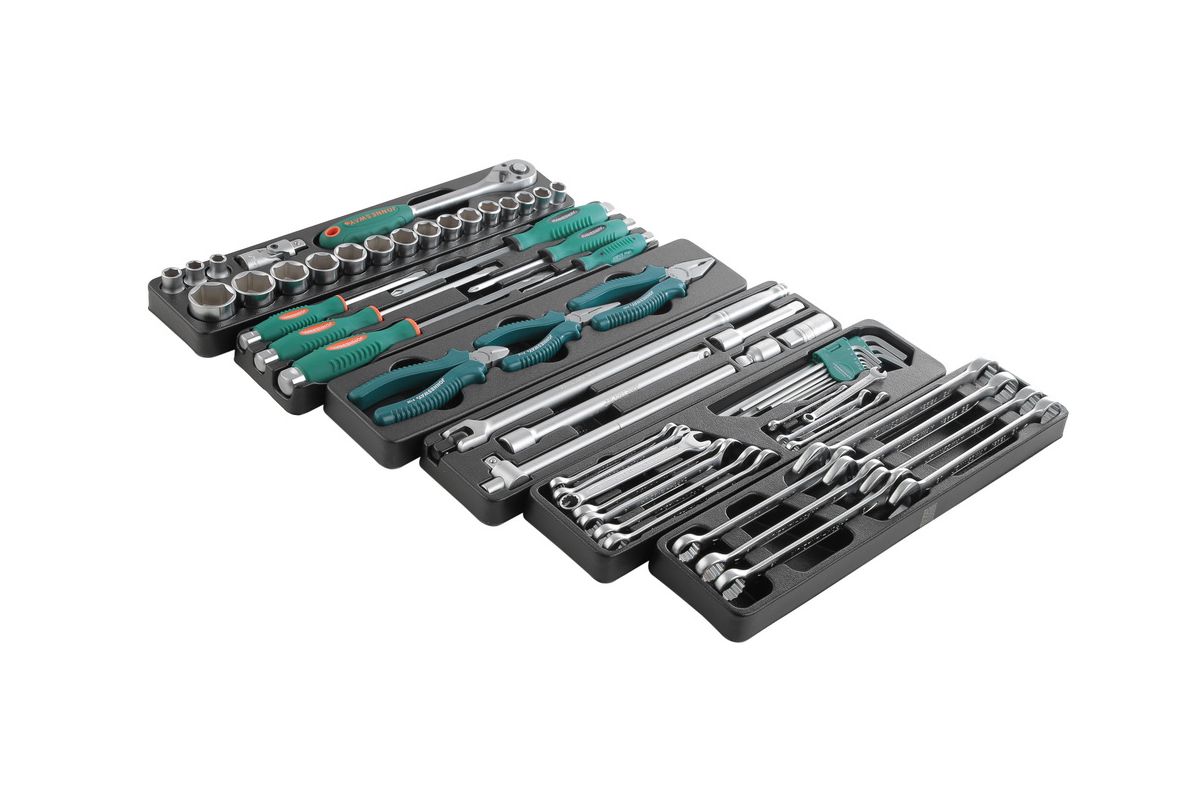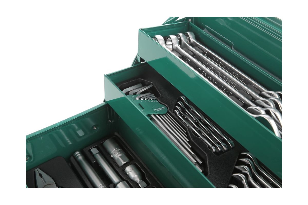 JONNESWAY C-3DH262 — большой набор инструментов в ящике. С его помощью можно организовать полноценное рабочее место в автосервисе. В комплекте 62 предметов, общий вес — 10 кг. Подходит для широкого спектра работ: бытового и авторемонта, монтажа и демонтажа металлоконструкций. Инструменты отличаются износостойкостью и отличной эргономикой за счет прорезиненных ручек. Ящик-трансформер обеспечивает быстрый доступ к любому ключу.