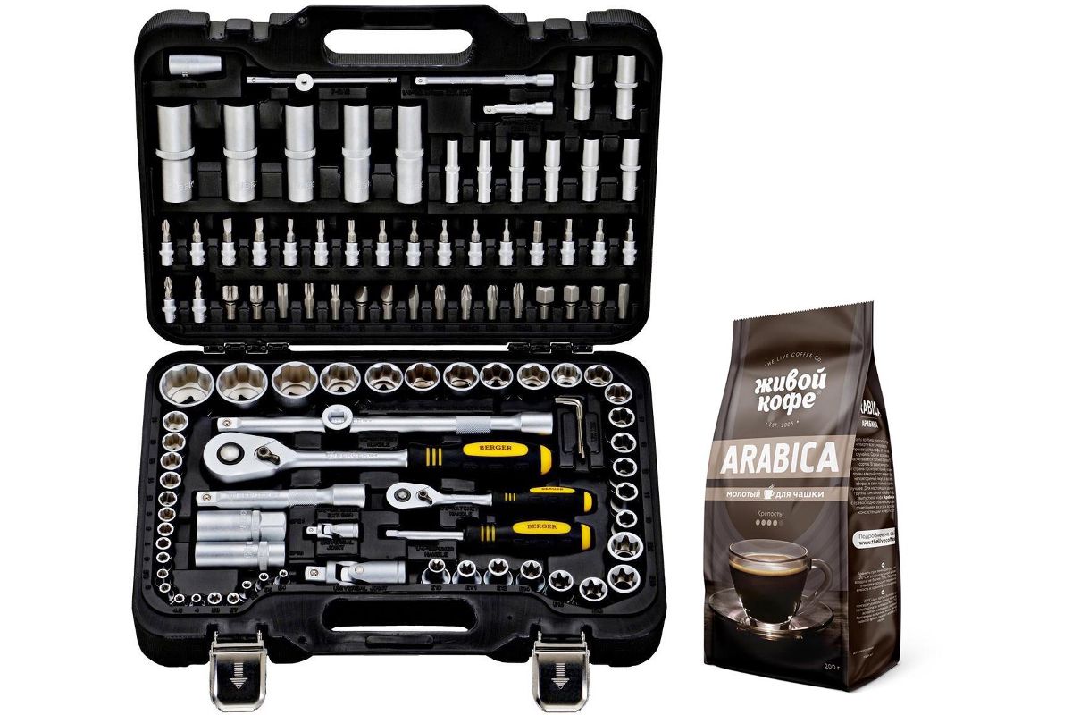В состав набора входят: Набор инструментов BERGER BG108-1214 108 предметов, Арабика кофе н/ж молотый - упак. 200г (темная пачка)