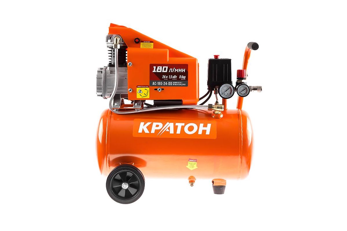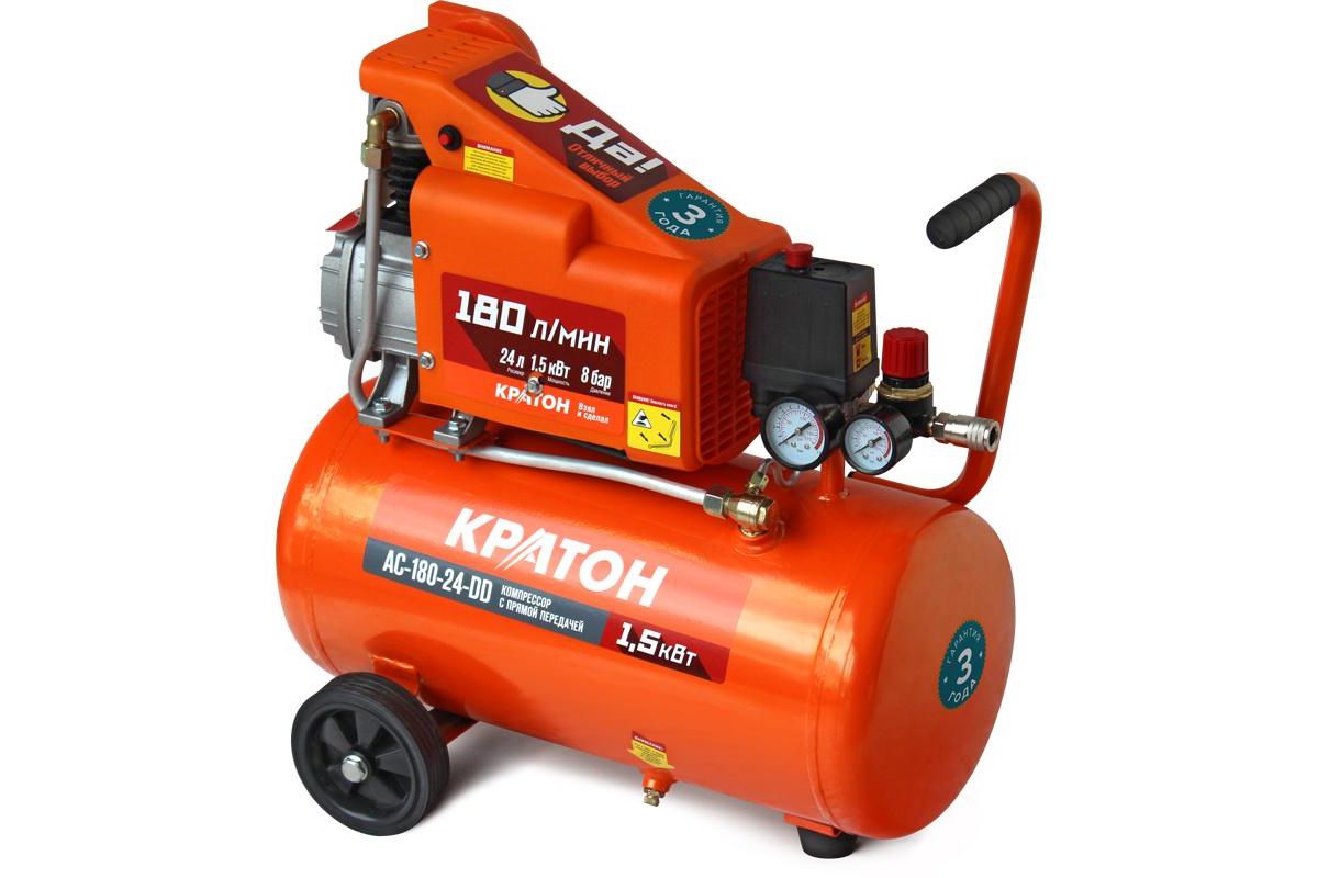 КРАТОН AC-180-24-DD – прямоприводной поршневой компрессор. Оборудован двигателем на 1500 Вт, перегоняет до 180 л воздуха в минуту. Подойдёт для работы с аэрографами, небольшими гвоздезабивными, заклёпочными и накачивающими пистолетами.