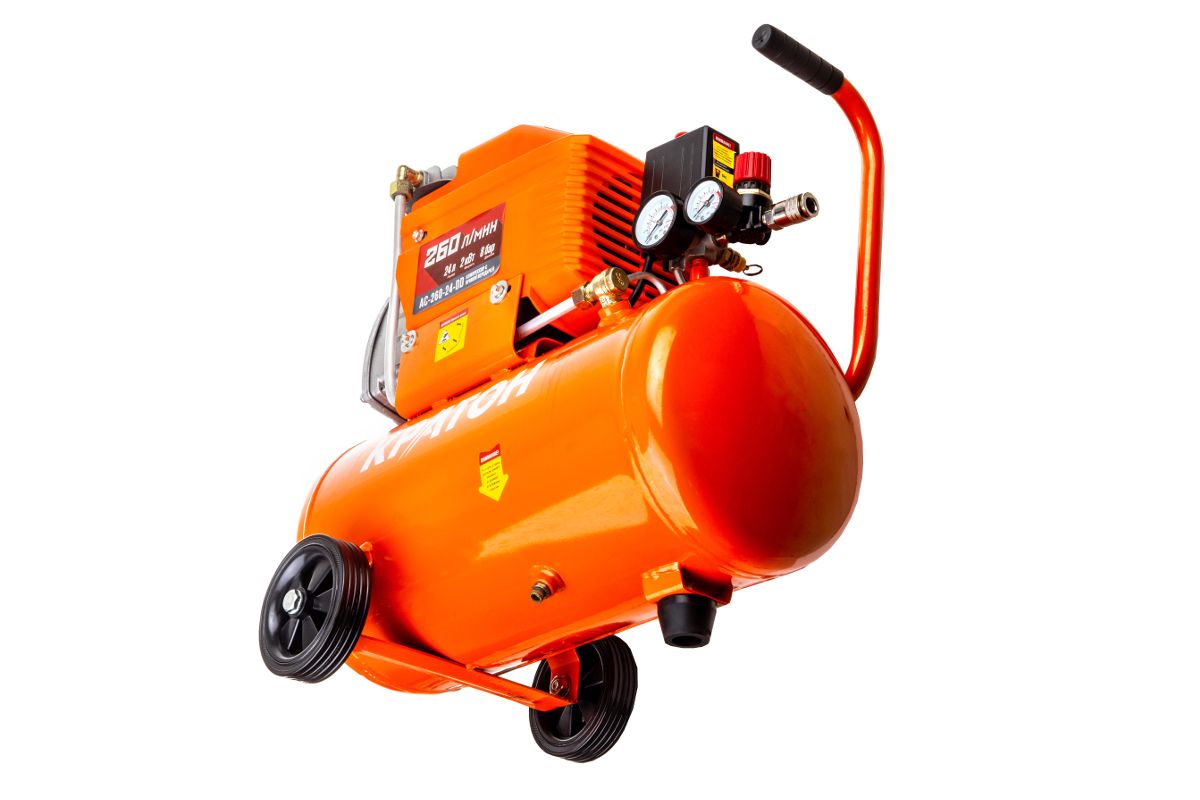 Поршневой компрессор КРАТОН AC-260-24-DD оборудован двигателем на 2000 Вт, перегоняет до 260 л воздуха в минуту. Подходит для работы с гайковёртами, небольшими краскопультами, аэрографами, продувочными и накачивающими пистолетами.