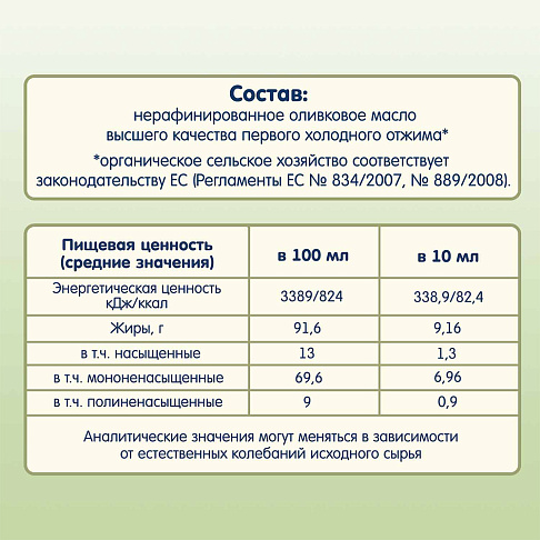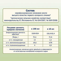 Согласно Программе оптимизации вскармливания детей первого года жизни в Российской Федерации (одобрена Союзом педиатров РФ) оливковое масло первого холодного отжима рекомендуется добавлять в продукты прикорма – овощные пюре, супчики, пасту, салаты, – начиная с 1-3 мл (1 капля), увеличивая к 12 месяцам до 5-6 мл (1 чайная ложка).