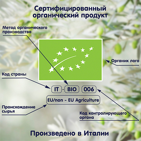 • Органический продукт, произведен и сертифицирован в соответствии с Регламентами Европейского Союза № 834/2007 и № 889/2008 об органическом сельском хозяйстве