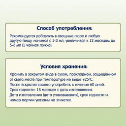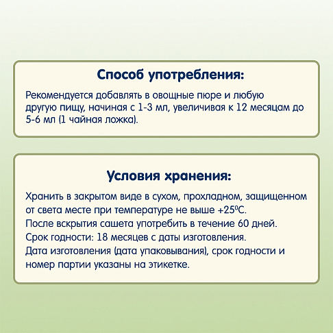 • Сашет масла удобен при использовании для детского питания, в том числе при введении оливкового масла в рацион малыша