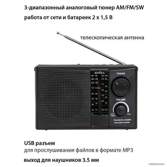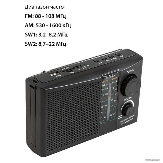 • Поддерживаемые длины волн аналогового вещания СВ (MW), КВ (SW), УКВ (VHF)