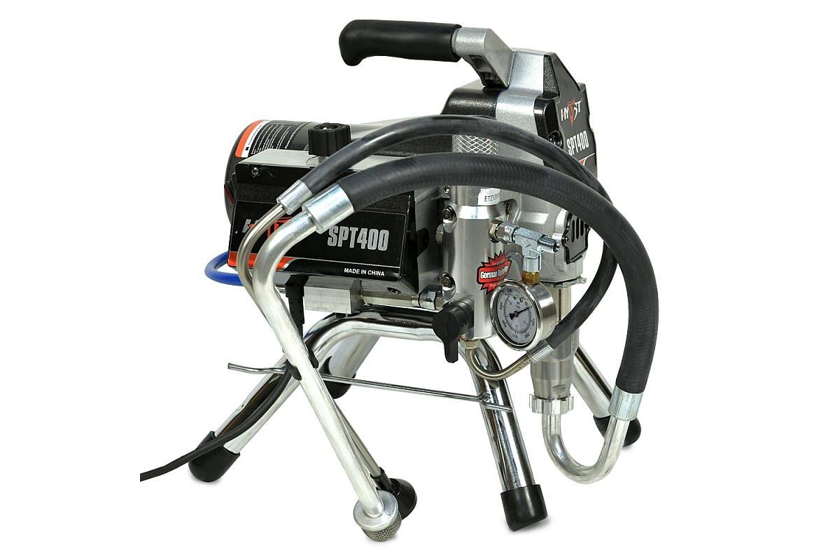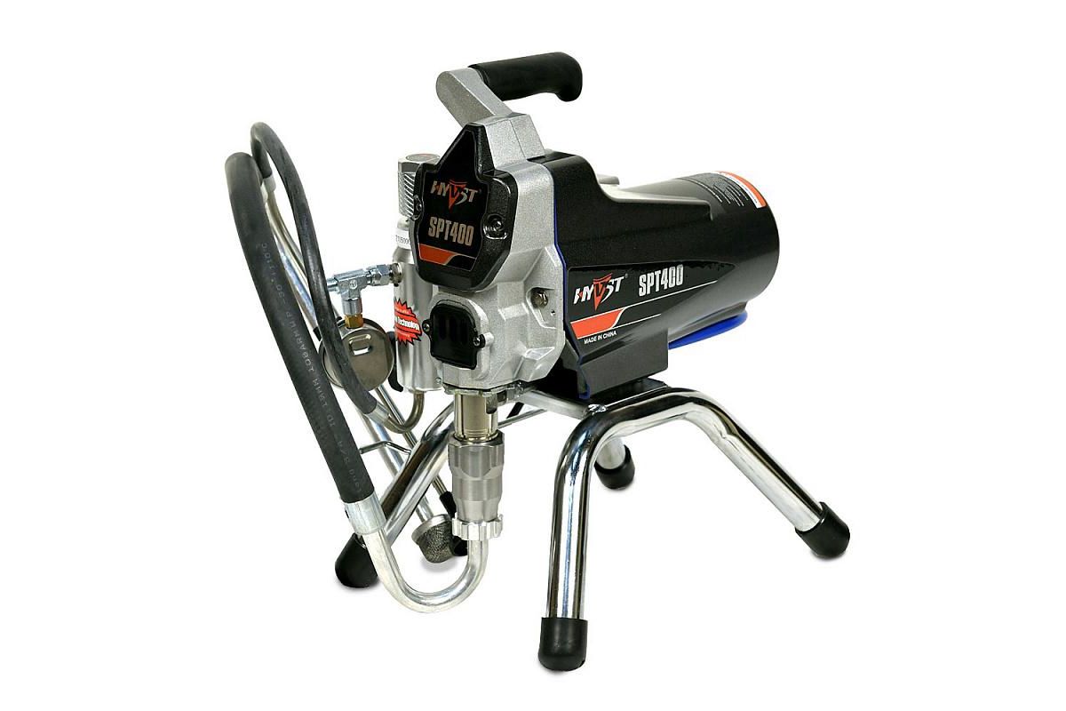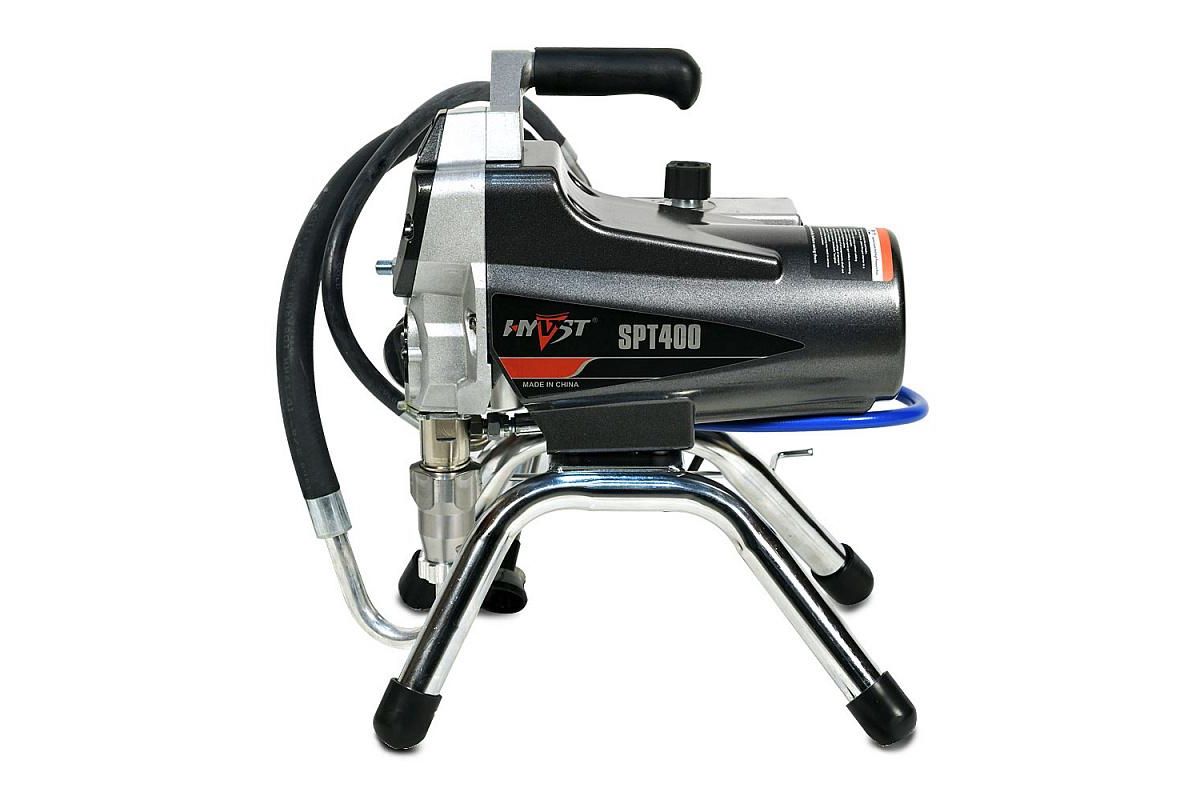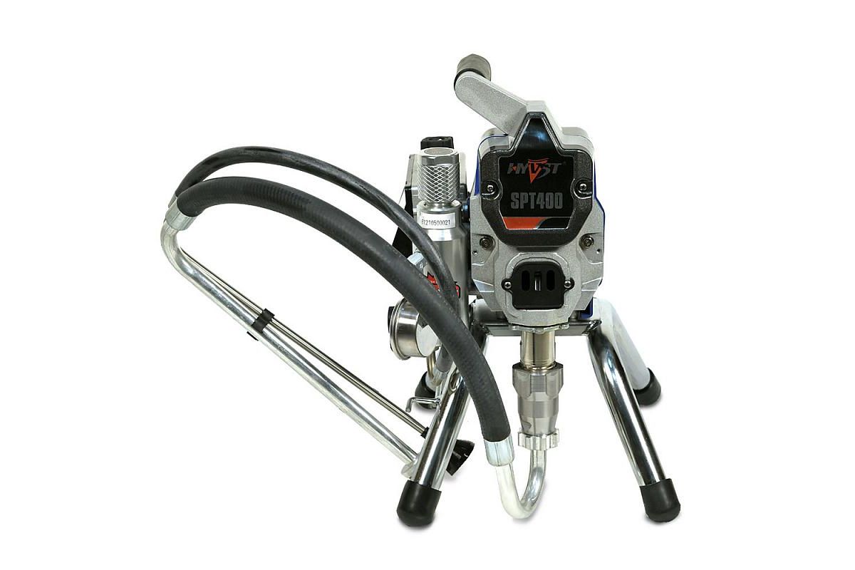 HYVST SPT 400 поршневой безвоздушный окрасочный аппарат (модернизированный HYVST SPT 390) предназначен для проведения покрасочных работ на строительной площадке. Применяется для покраски стен, потолков, фасадов, покраске и грунтования металлических конструкций. Окрасочный агрегат можно использовать с красками на водной основе и на базе растворителя. Можно применять с водоэмульсионными красками, латексными, акриловыми, масляными, ПФ 115, ГФ 021 и пр. Окрасочный аппарат работает только на один пистолет. Максимальная длина шланга от аппарата до краскопульта в теплую погоду - 30-45 метров.