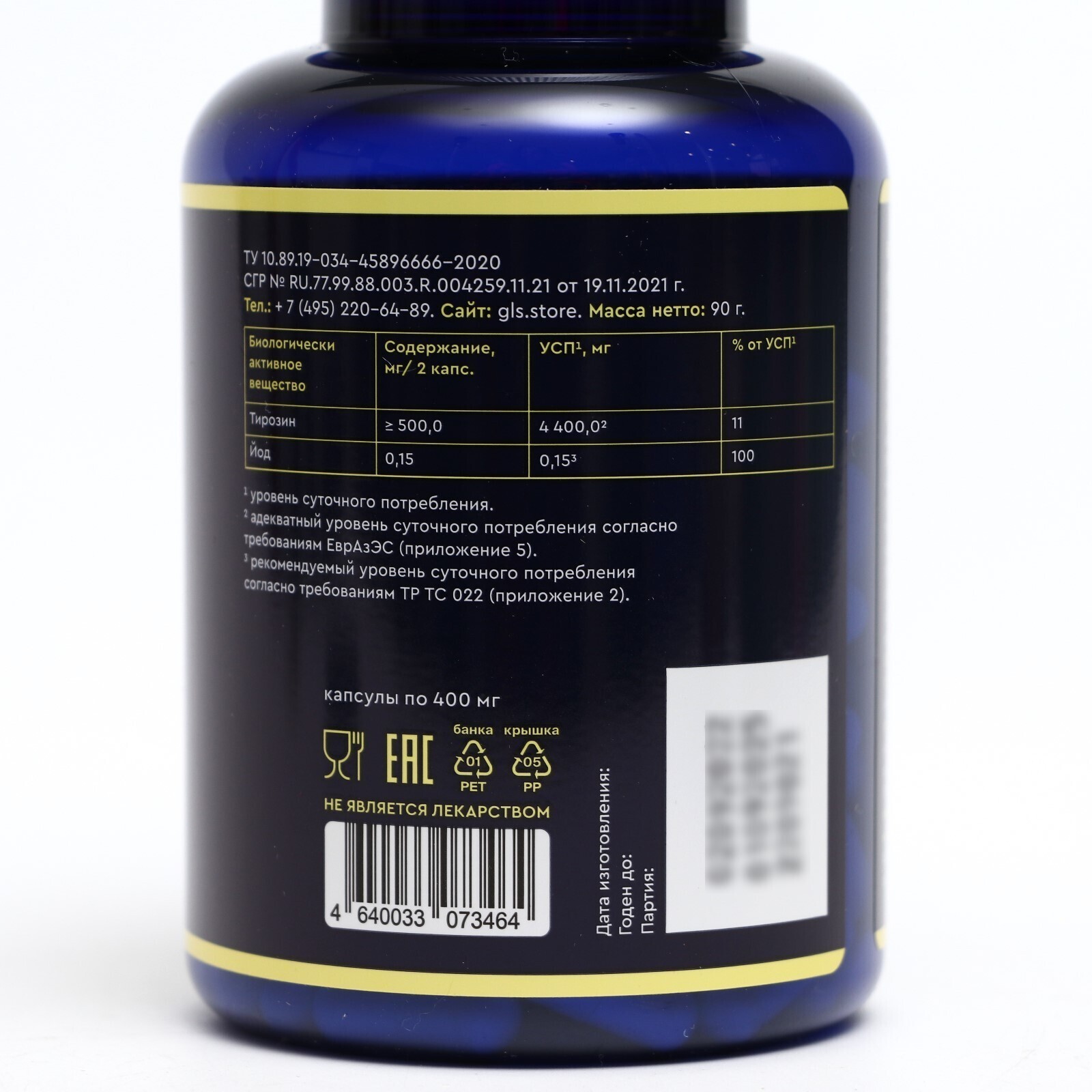 Тирозин 500 GLS, 180 капсул по 400 мг