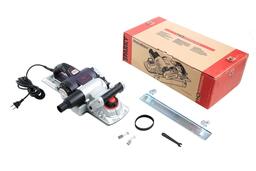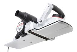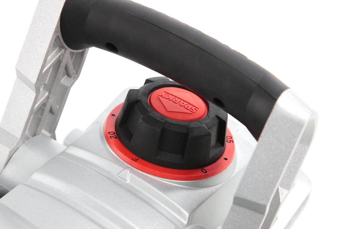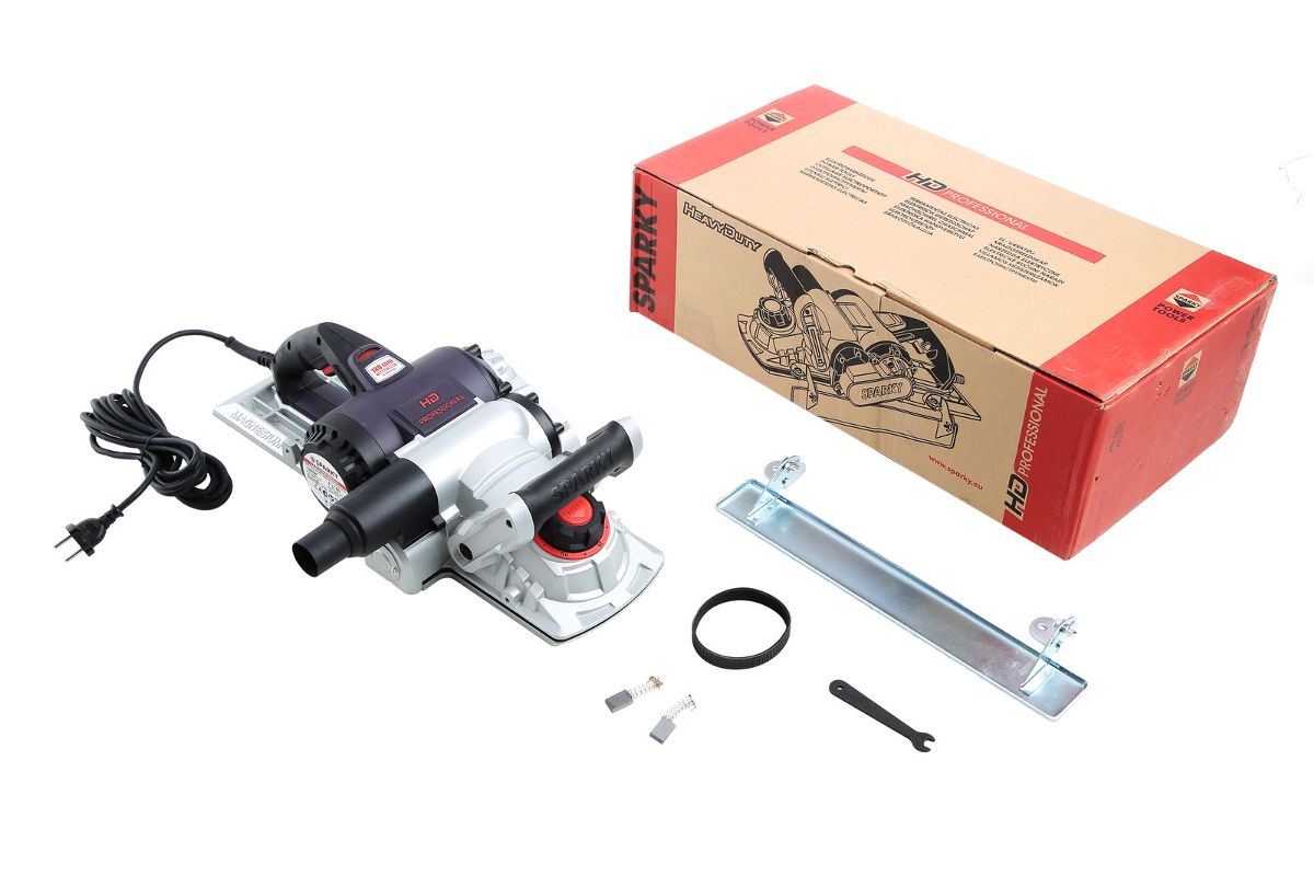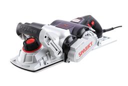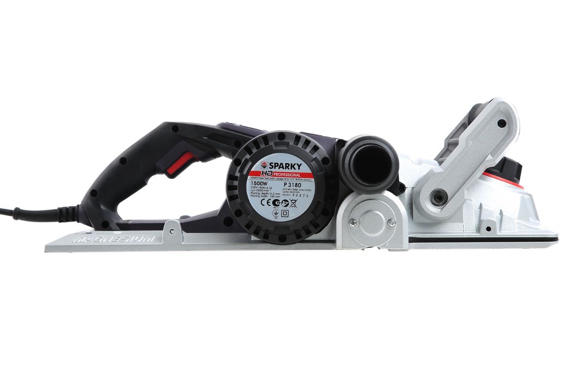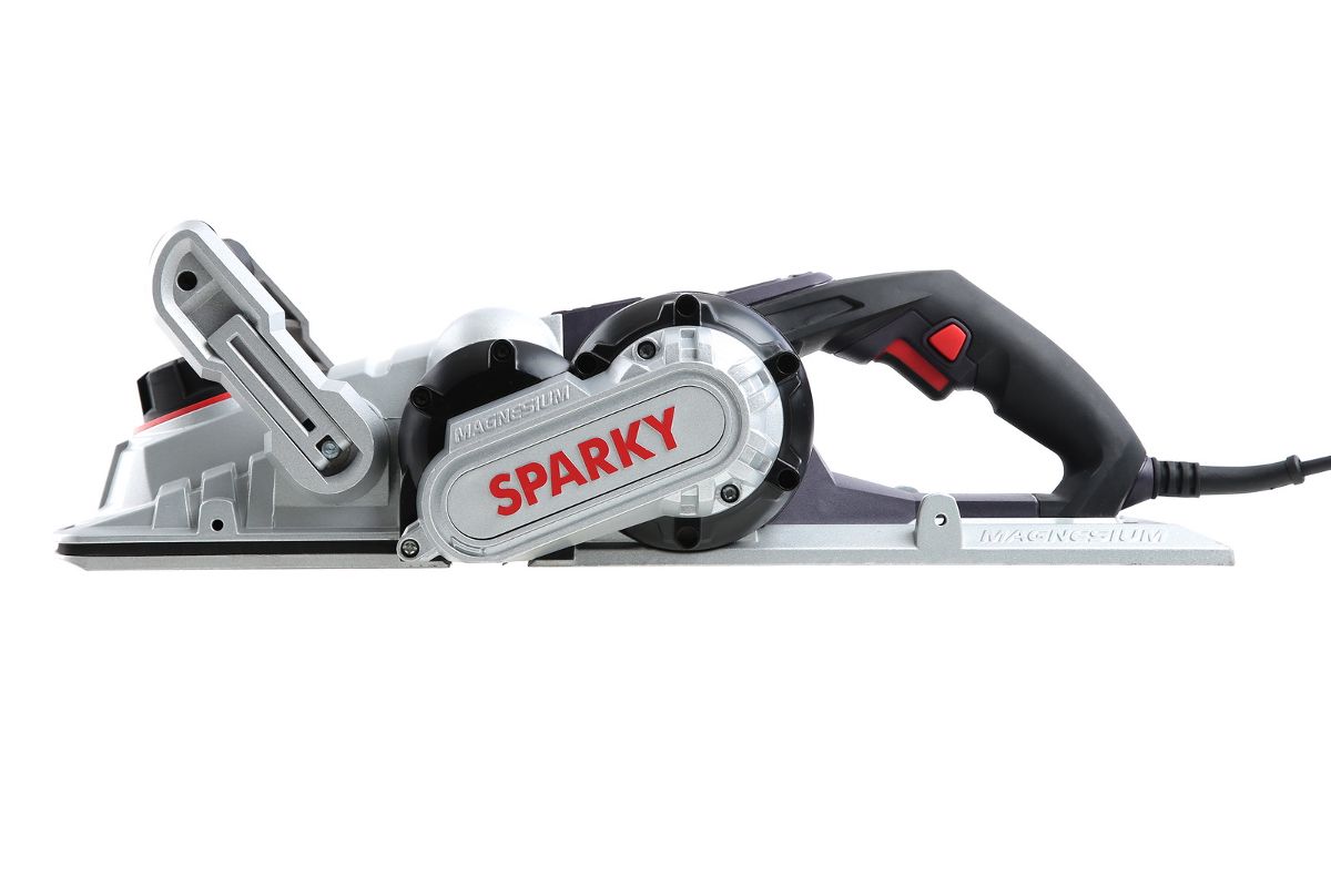 Самый мощный инструмент для строгания от Спарки (1500 Ватт). Удлиненная подошва; подвижная передняя рукоятка. Ширина лезвий — 180 миллиметров; глубина строгания (макс.) — 2 миллиметра; вес — 8,5 кг. Особенности: регулировка глубины среза; подвижное переднее и статичное заднее основания; блокировка пуска; индикатор сети; возможность подключения комбинированной направляющей и пылесоса.