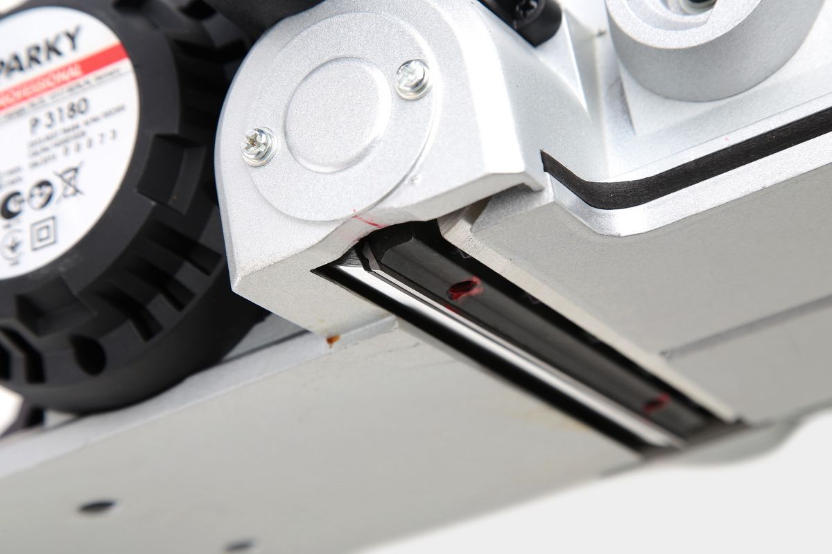 Одно из главных его преимуществ — улучшенный корпус. Алюминиевая подошва состоит из двух частей – подвижной передней и статичной задней. Вместе они образуют удлиненную плиту, которая плавно перемещается по поверхности заготовки.