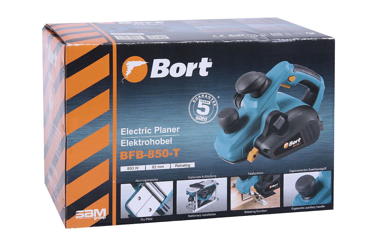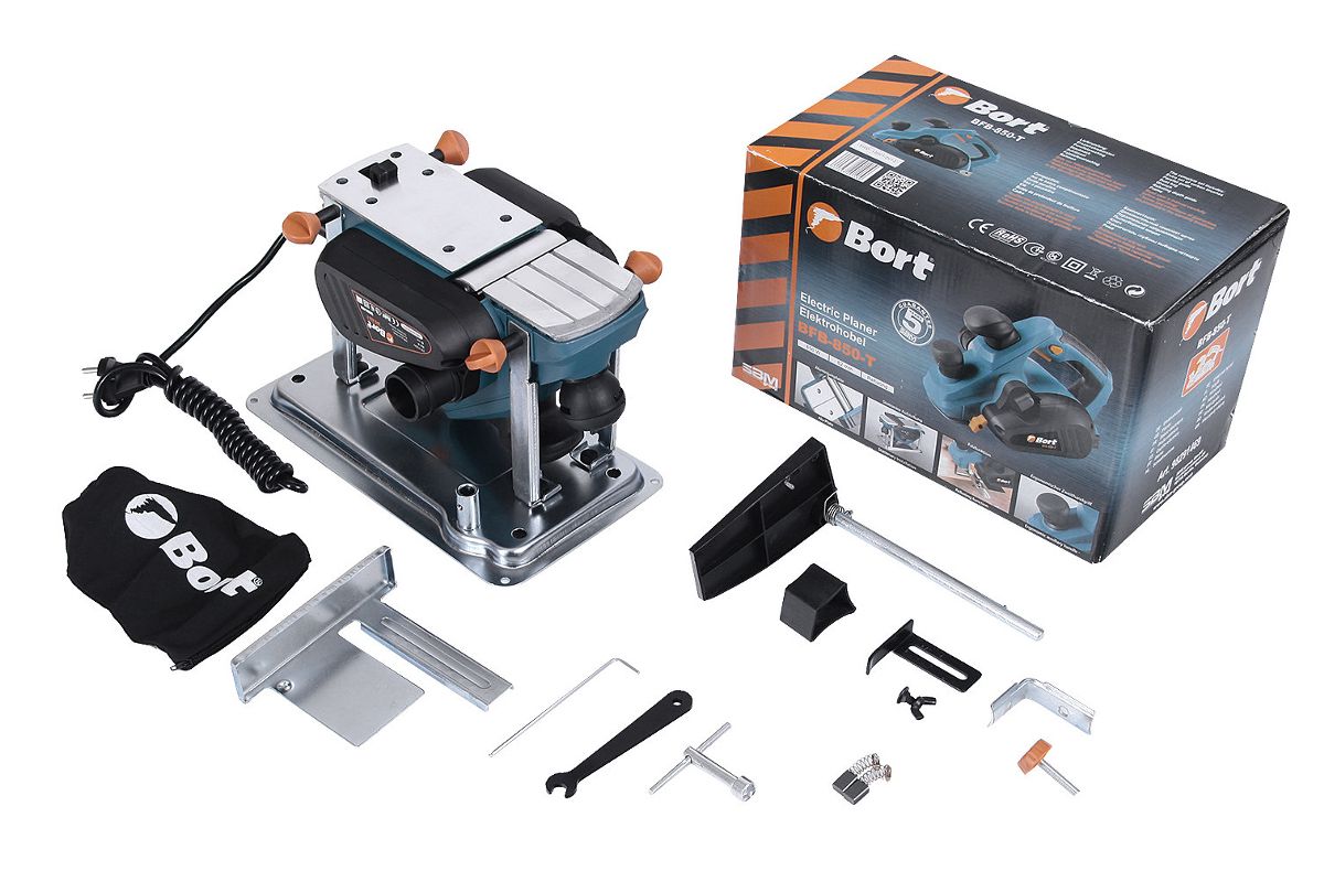 Данная модель — самая мощная (0,85 киловатта) в линейке Bort. Толщина снимаемой стружки — до 3 миллиметров. Преимущества: регулировка толщины среза; отвод стружки вправо/влево; V-образный паз на подошве; направляющая, ограничитель глубины. В комплекте — мешок-пылесборник и сменные щетки.