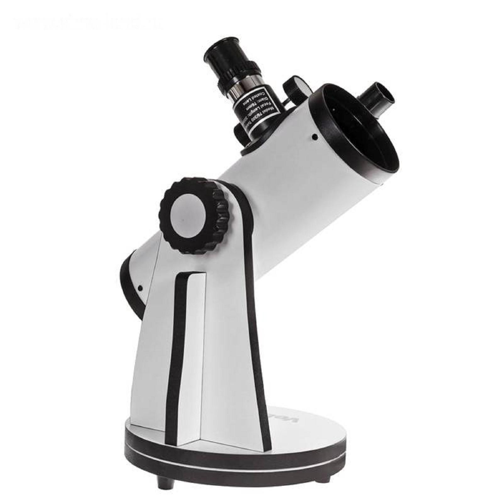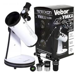 Телескоп Veber Умка 76/300 это классический рефлектор Ньютона на азимутальной монтировке «турельного» типа (Монтировка Добсона). При таких небольших размерах (длина трубы 300 мм, 76 мм диаметр) может показаться, что это детский телескоп, но посмотрите в него- и ваше мнение изменится кардинально. Качественное изготовление и надежная конструкция телескопа позволят без труда и в деталях рассмотреть любые звезды и объекты солнечной системы. Тем более, что с увеличением 15 крат (окуляр Н20 мм) вы сможете сфокусироваться и днем на любые объекты. Этот телескоп можно использовать и как настольную зрительную трубу.