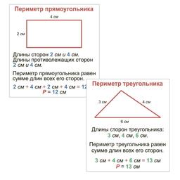 «Математика. Периметр. Площадь. Объём» познакомят школьников начальных классов: - с математическими терминами и понятиями; - геометрическими фигурами и телами (квадрат, прямоугольник, куб, треугольник, параллелепипед), геометрическими величинами; - единицами однородных величин и соотношения между ними; - изображением фигур на плоскости и в пространстве; - правилами вычисления площади, периметра, объёма. Работа с карточками направлена на формирование у учащихся интереса к изучению курса геометрии; сохранение, закрепление и развитие пространственных представлений; овладение основами логического и алгоритмического мышления; развитие математической речи и навыков наглядного представления данных в разной форме (таблице, схеме). Комплект предназначен ученикам 1-4 классов в качестве опорных понятий, схем, таблиц по теме «Периметр. Площадь. Объём», а также учителям и родителям для занятий с детьми.